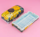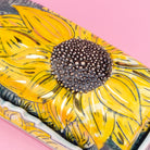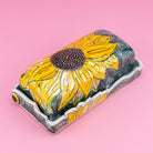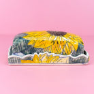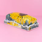A vibrant sunflower adorns this butter dish with gold luster accents. A delightful home for a delightful condiment!