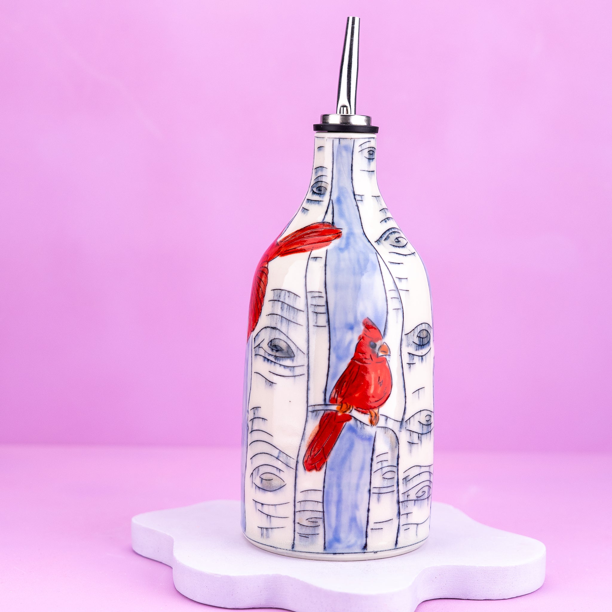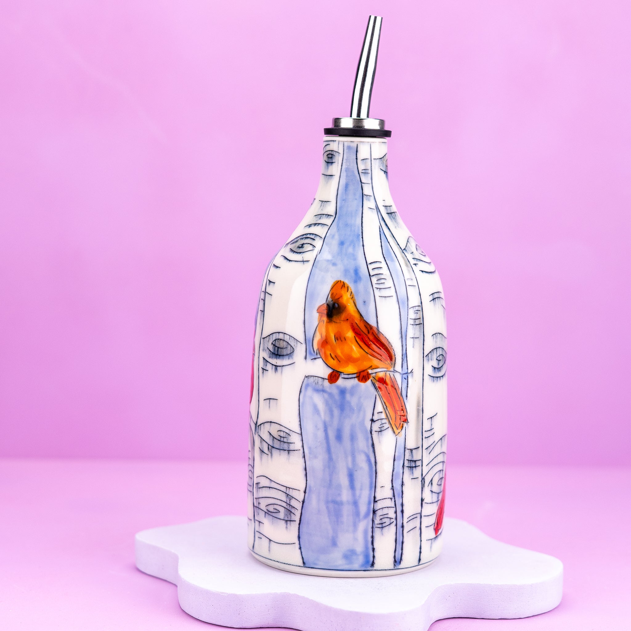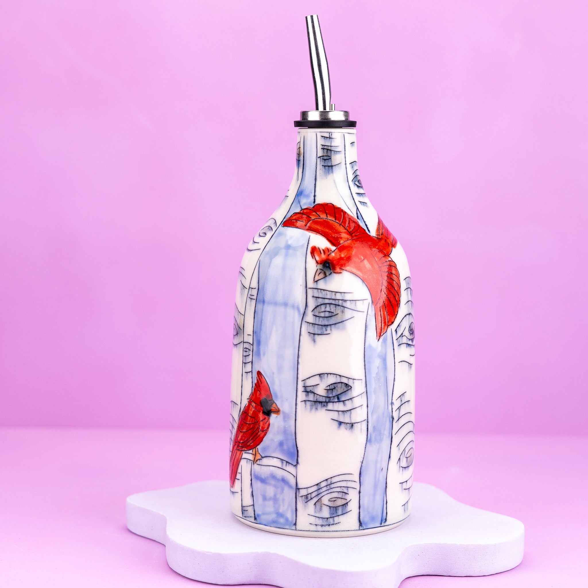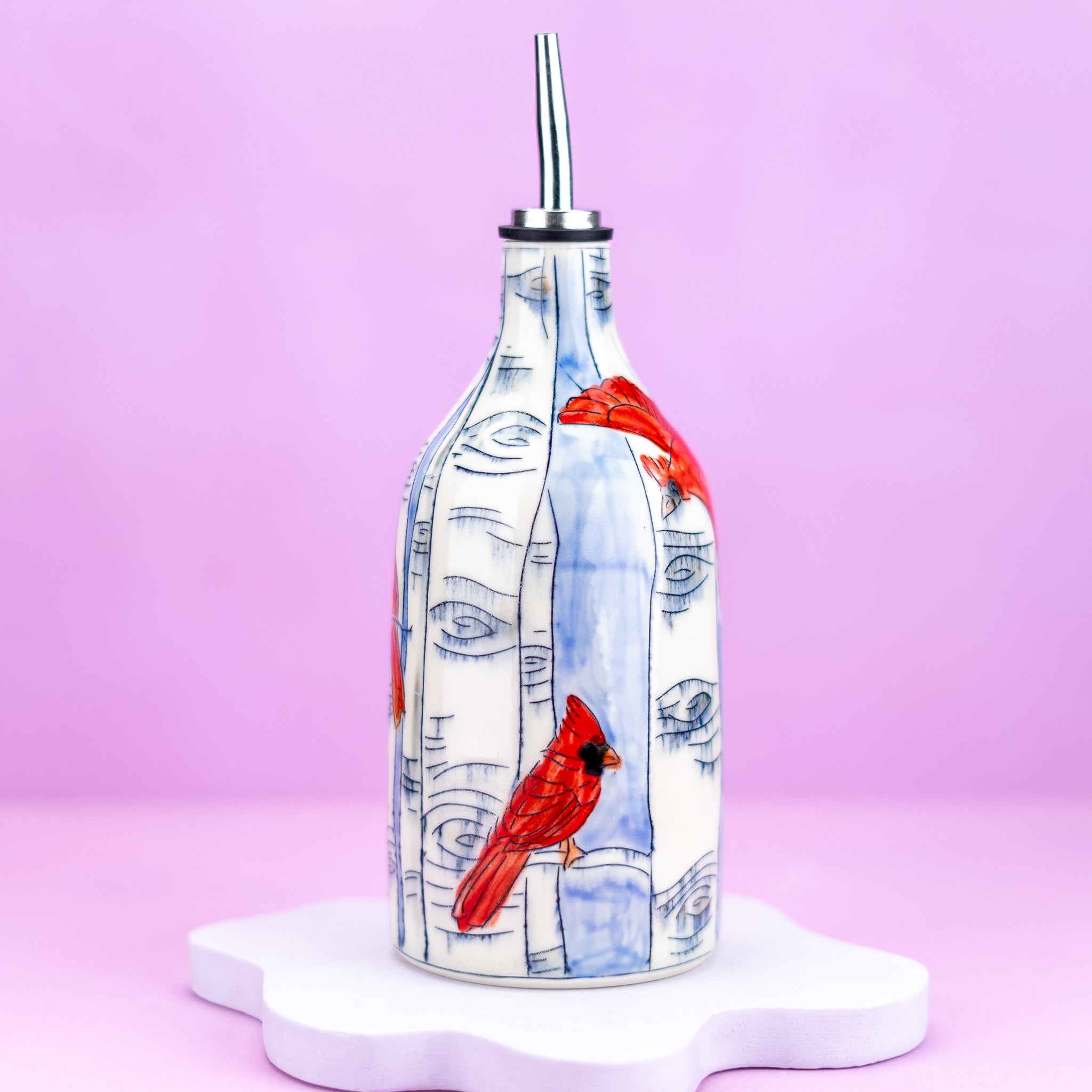 This piece features illustrations of vibrant cardinals amongst birch trees. Ideal for storing your soap or extra virgin olive oil with a touch of whimsy and style.