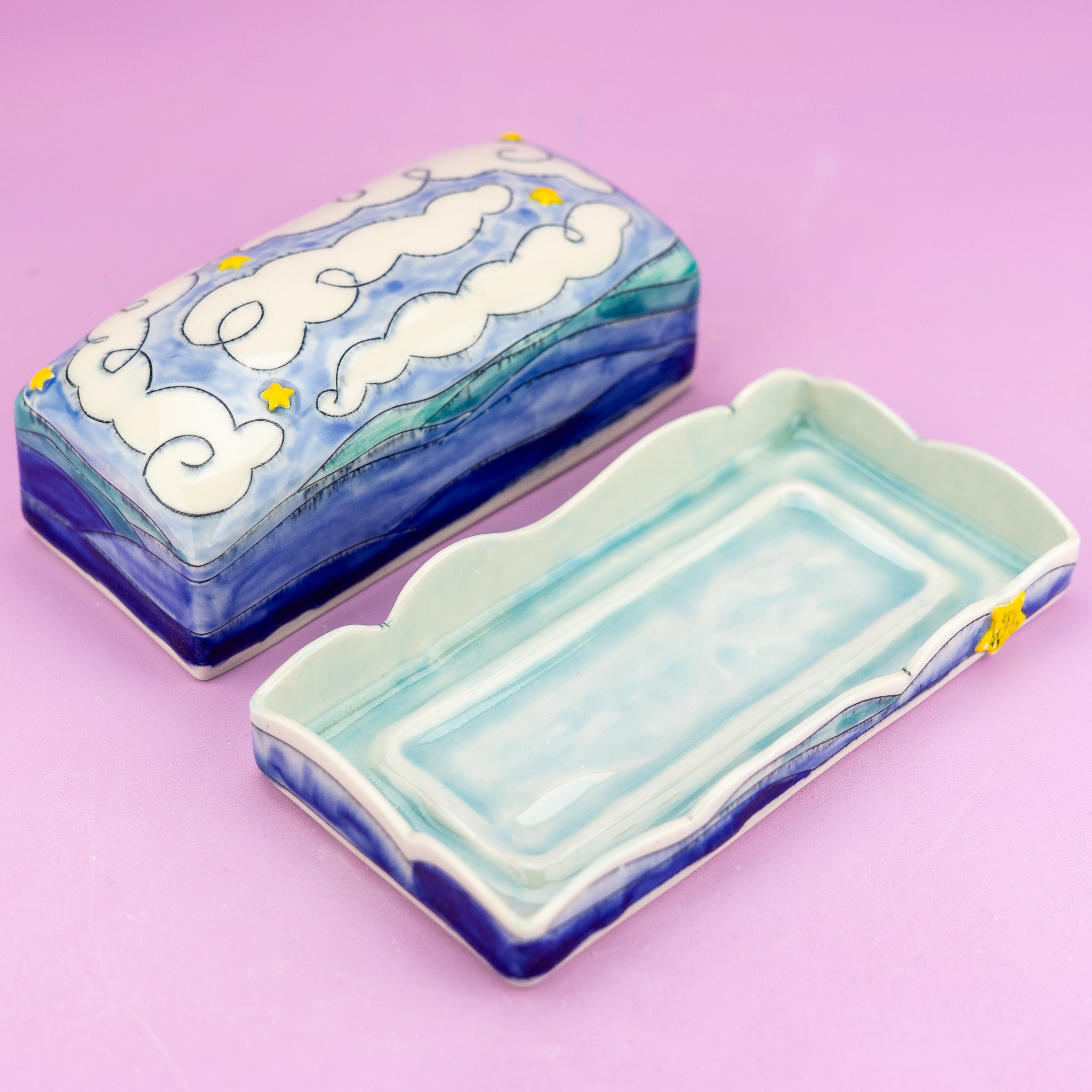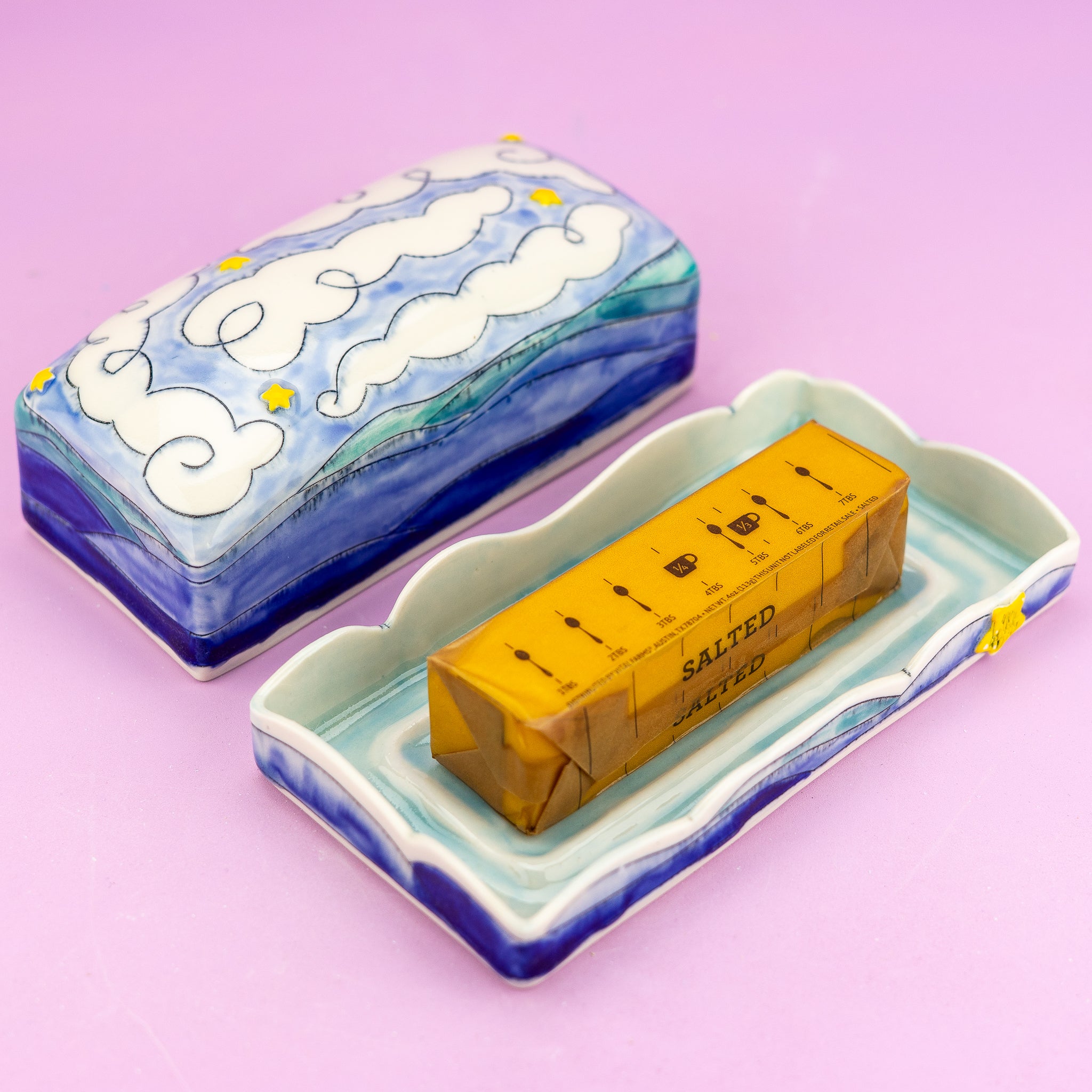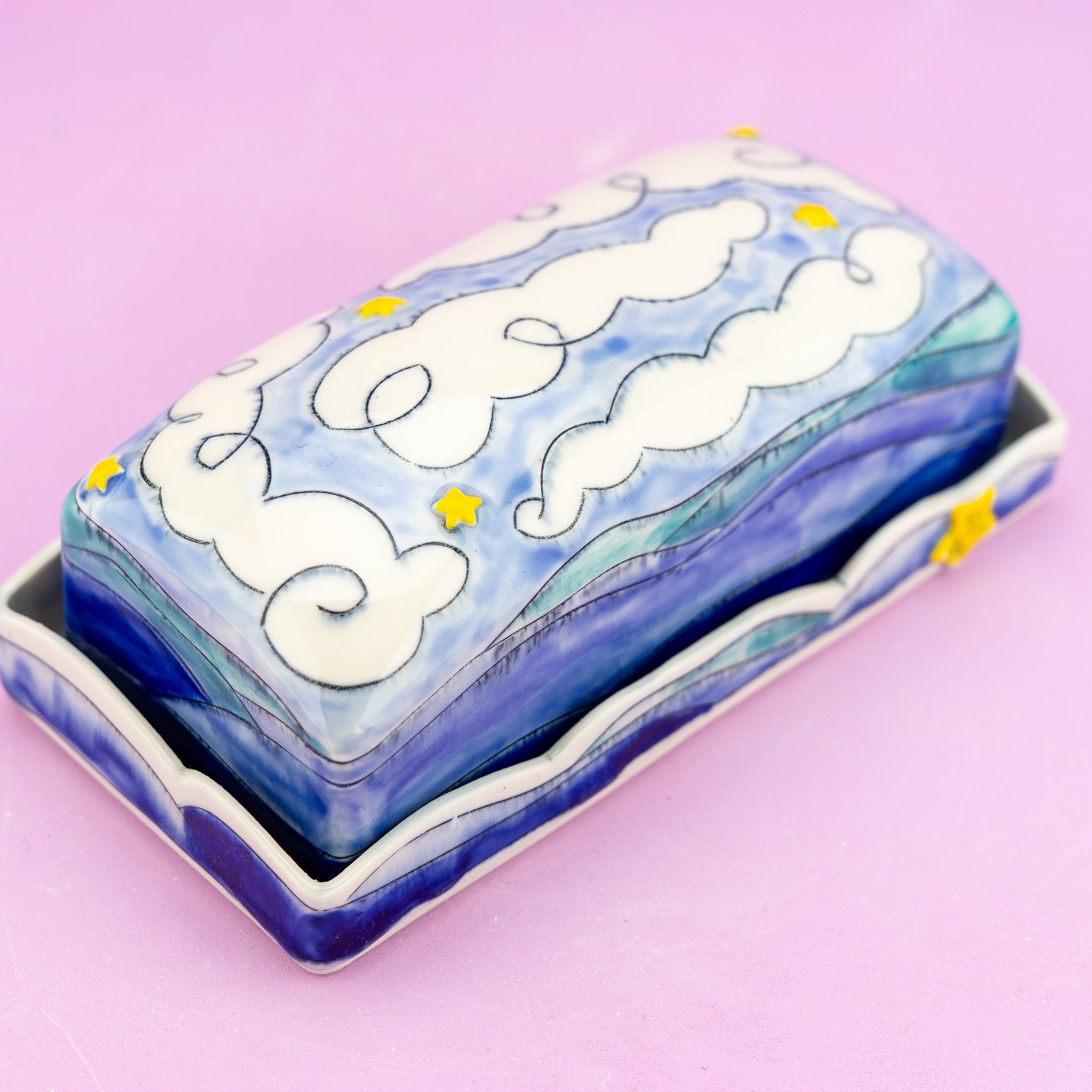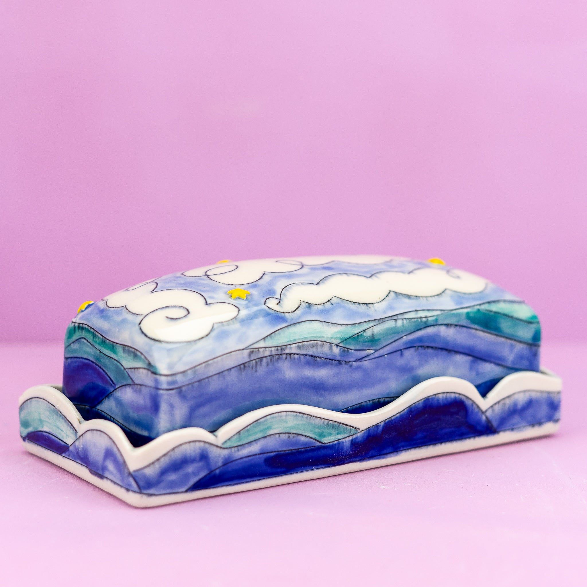 Store your butter in style with this charming mountain-themed dish, complete with rolling peaks, fluffy clouds, and twinkling stars. A whimsical touch that transforms an everyday kitchen essential into a conversation starter.