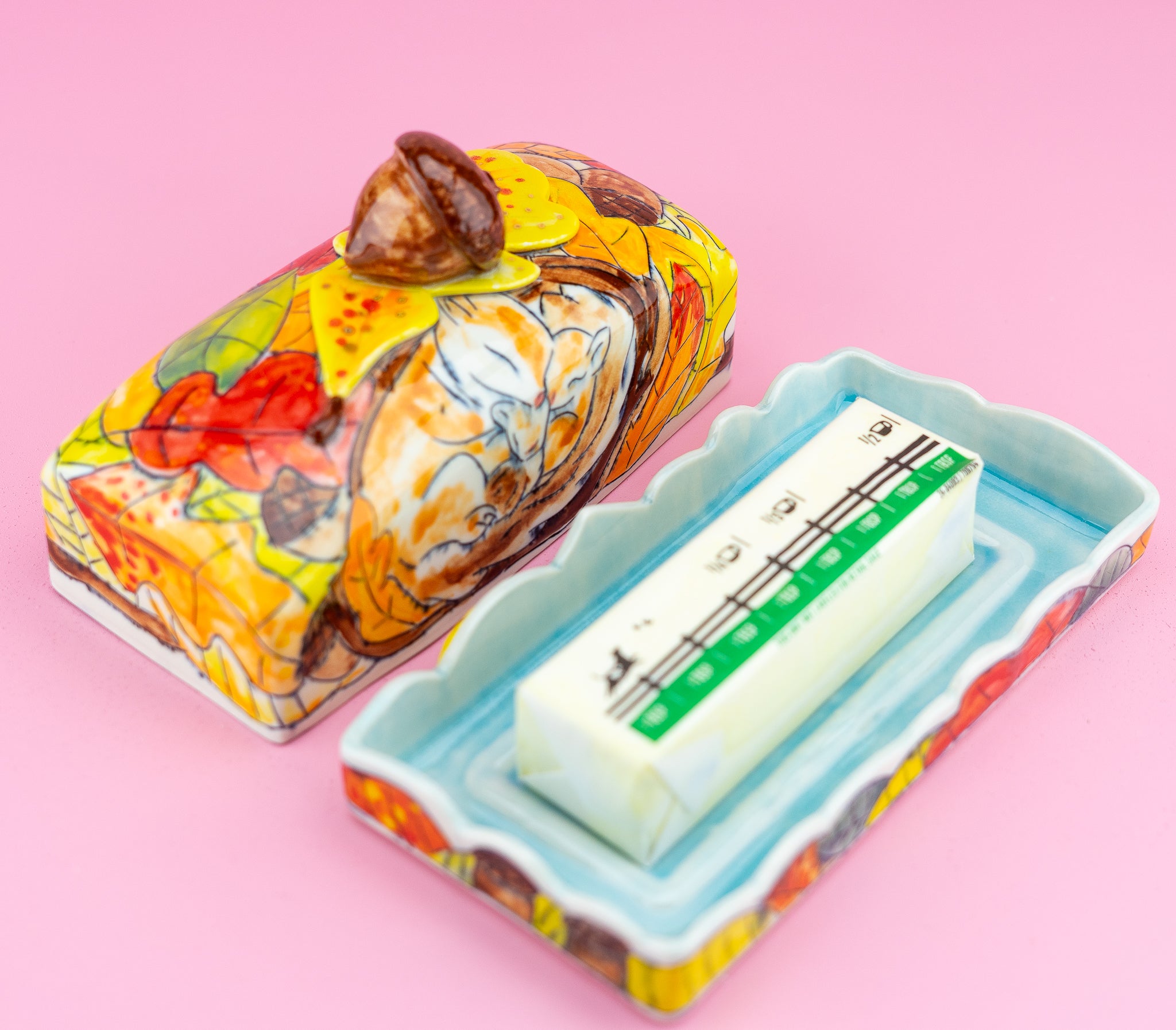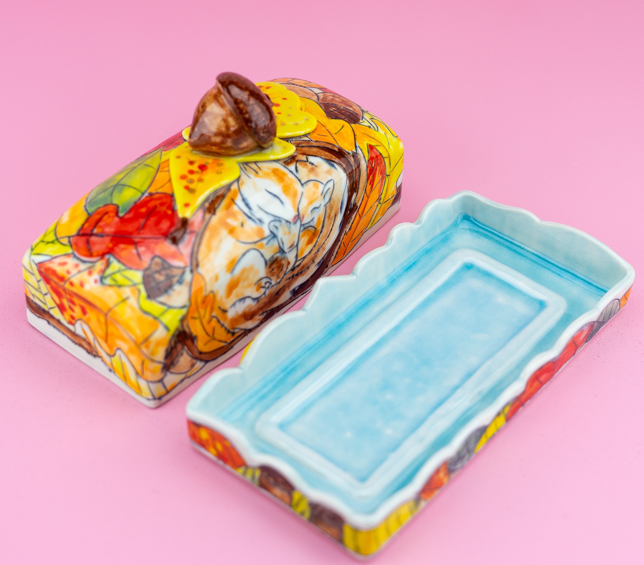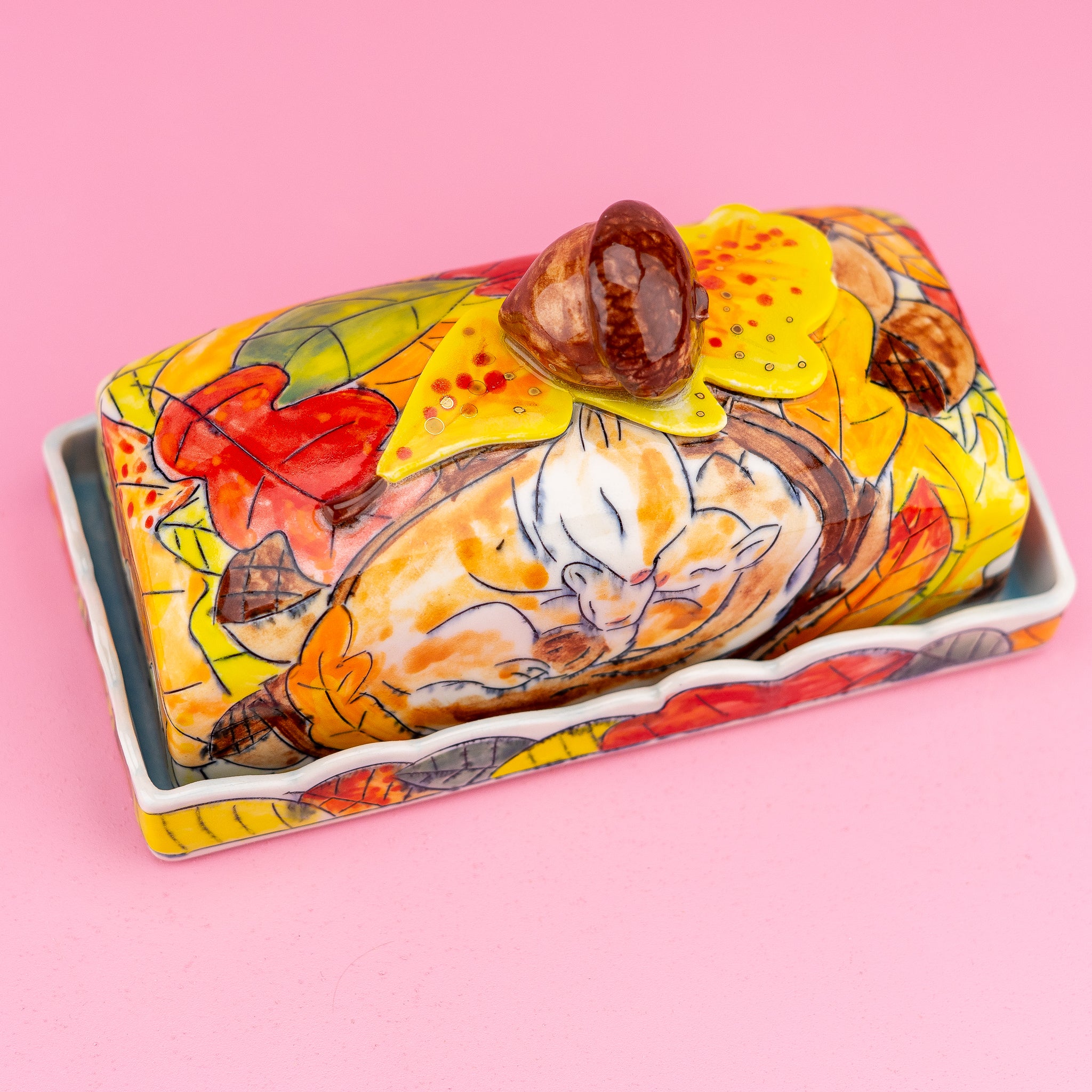 Add a cozy vibe to your kitchen with this delightful butter dish featuring a sleepy squirrel snuggled up among autumn leaves. A delightful home for a delightful condiment!