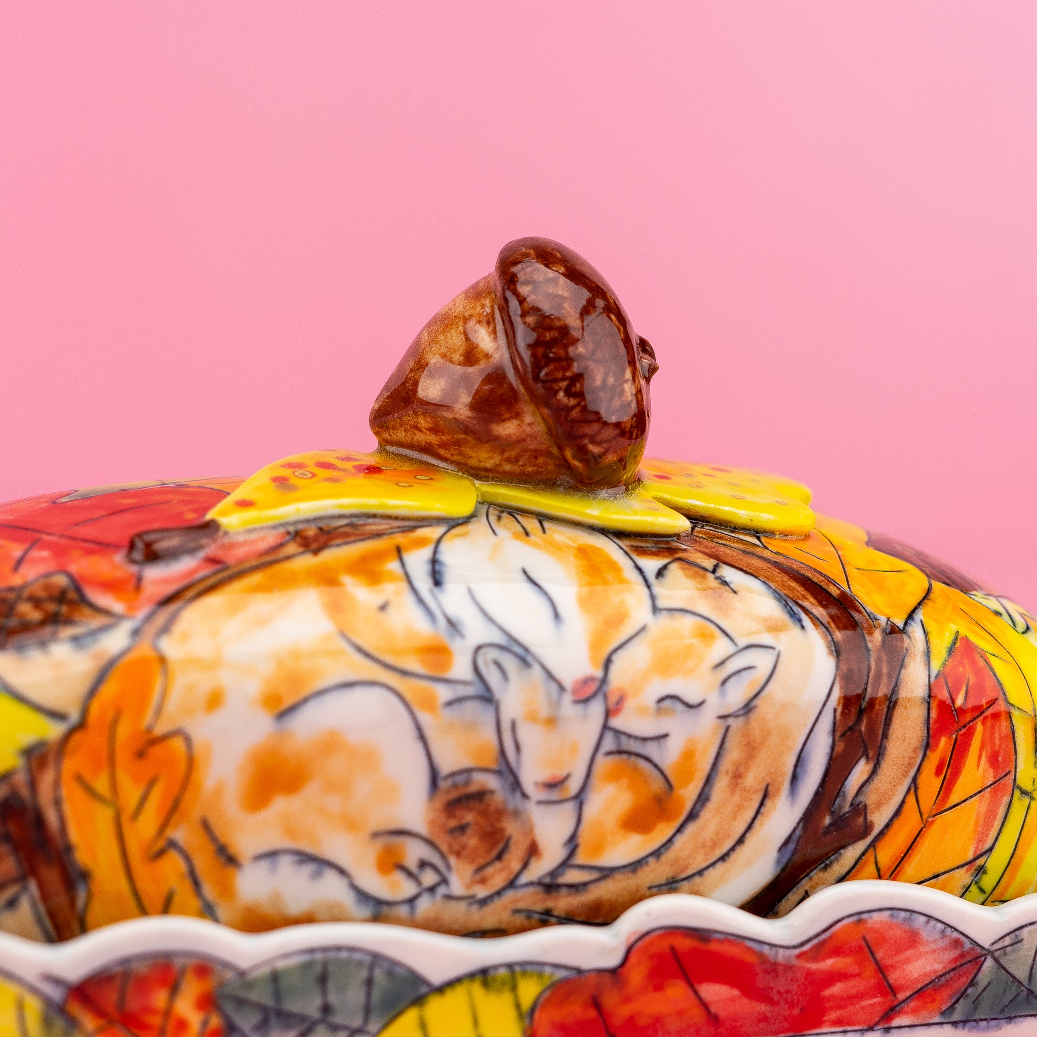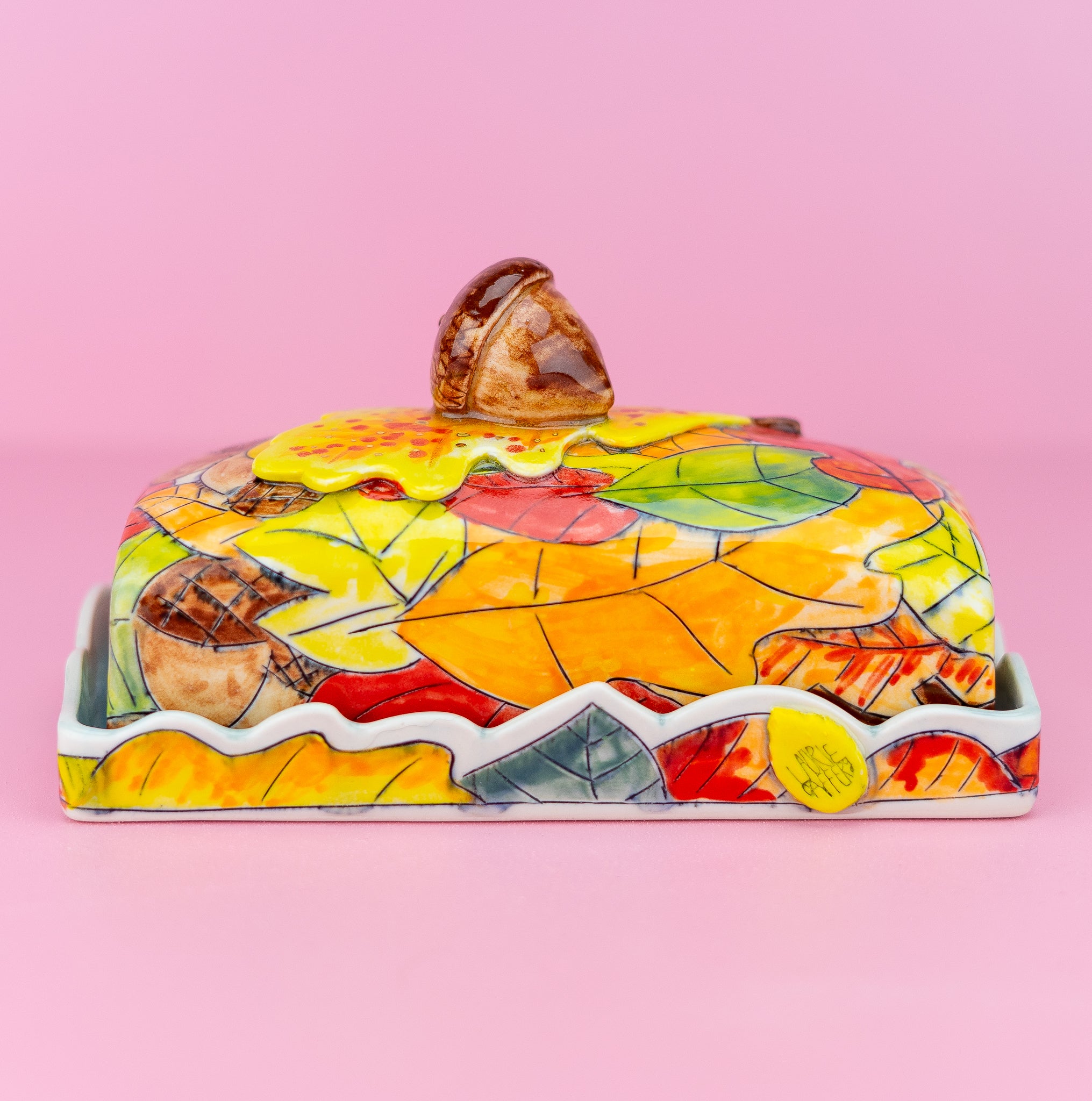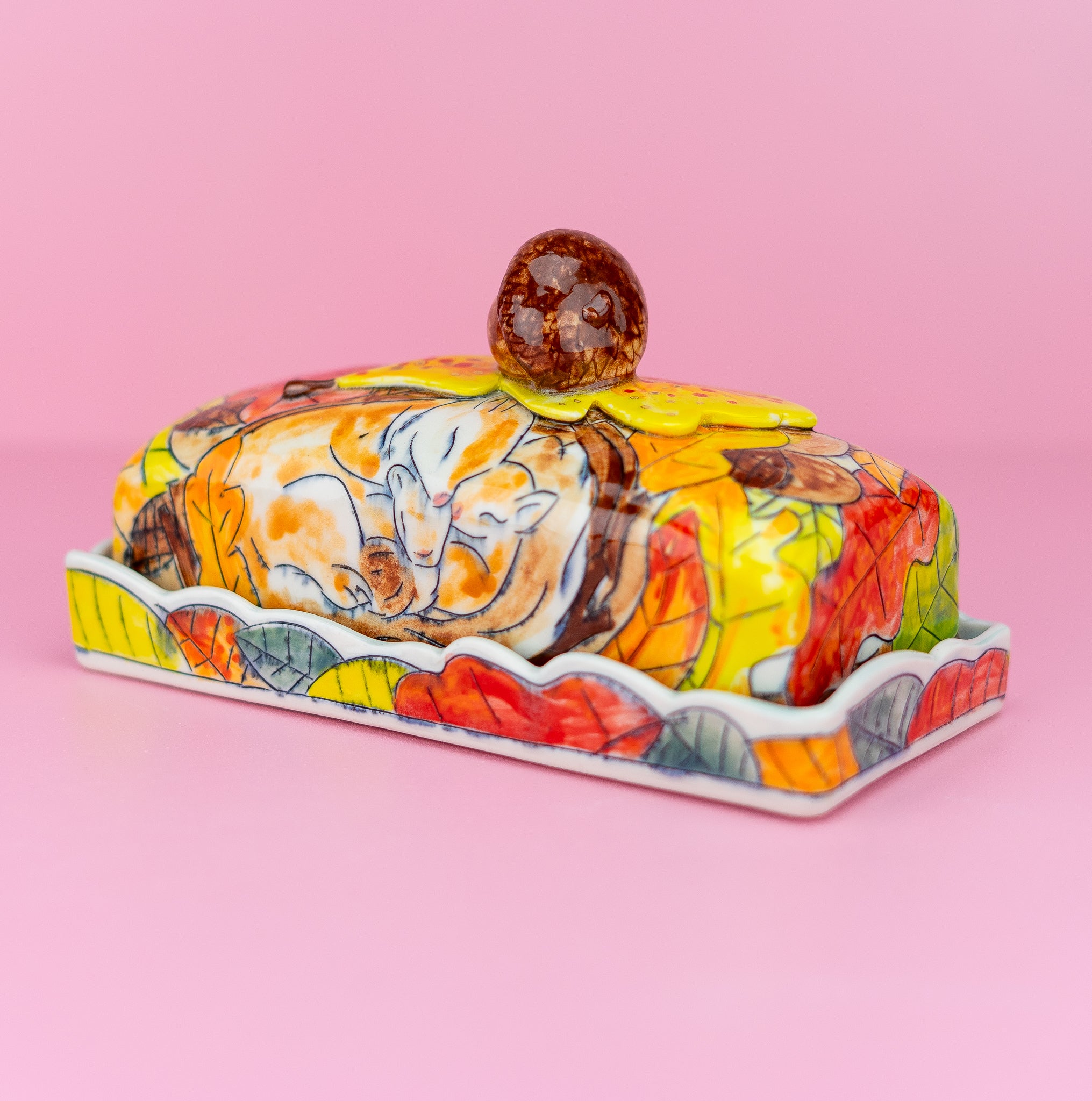 Add a cozy vibe to your kitchen with this delightful butter dish featuring a sleepy squirrel snuggled up among autumn leaves. A delightful home for a delightful condiment!