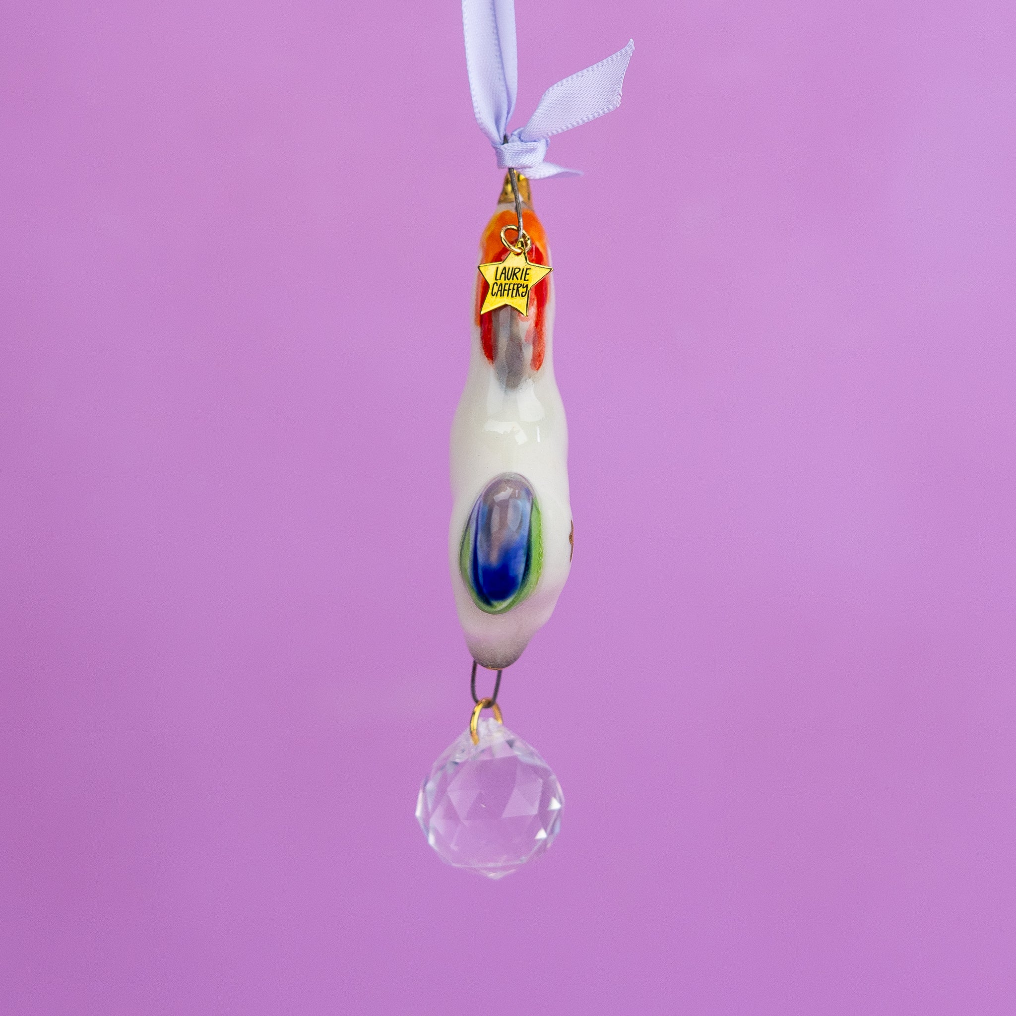 Porcelain ornaments are more durable than you might think, but still require similar care to a glass ornament. Handle with care and be mindful of the embedded wire hangers, and this piece will last a lifetime.