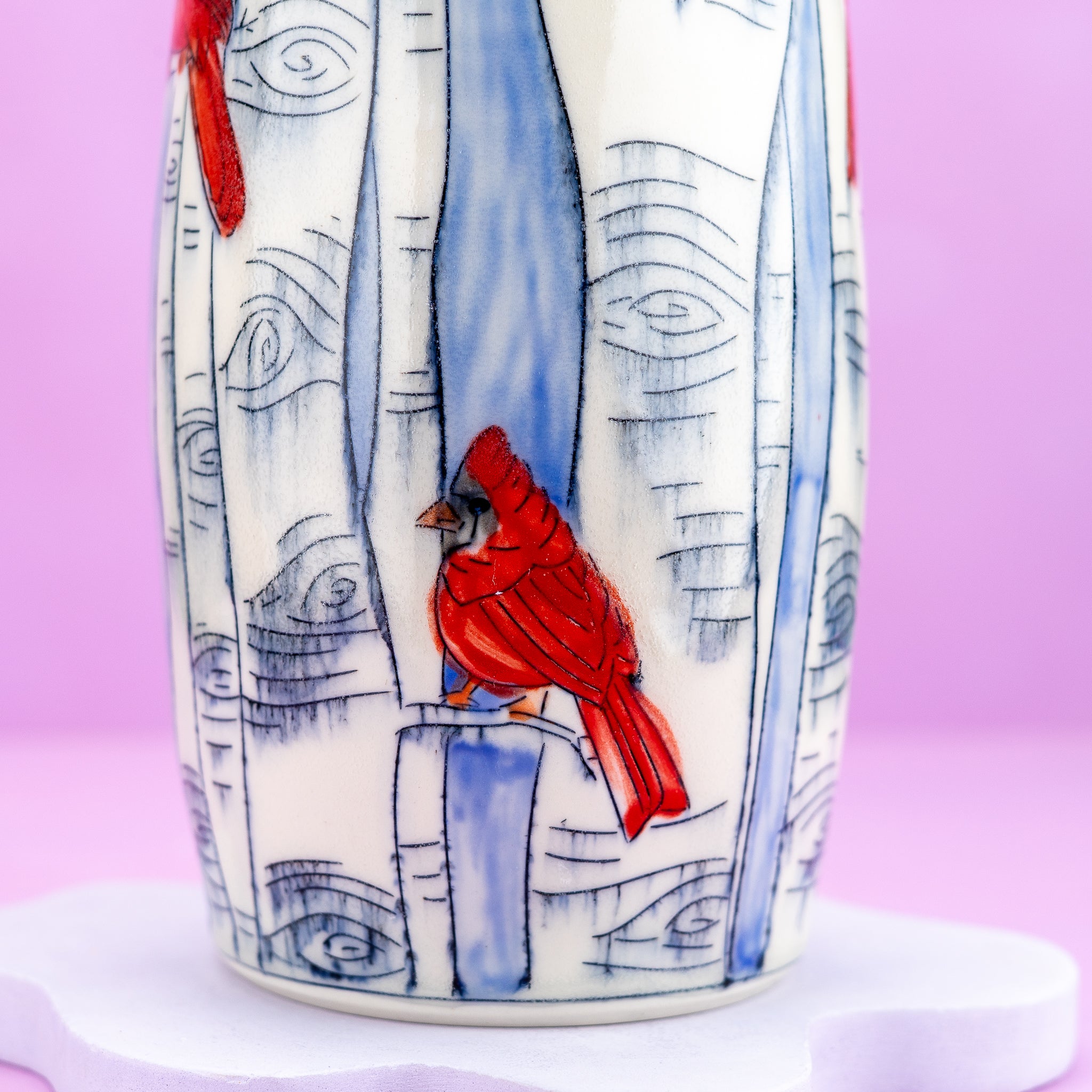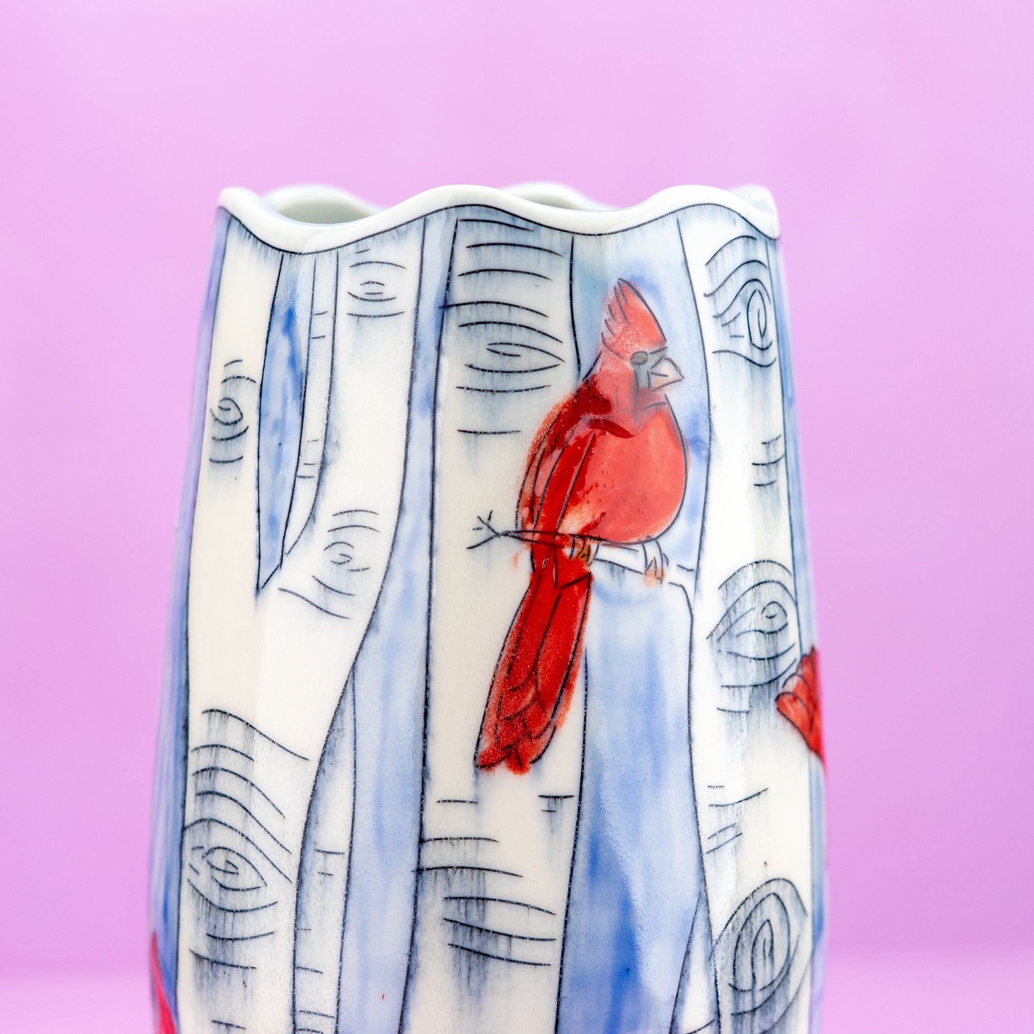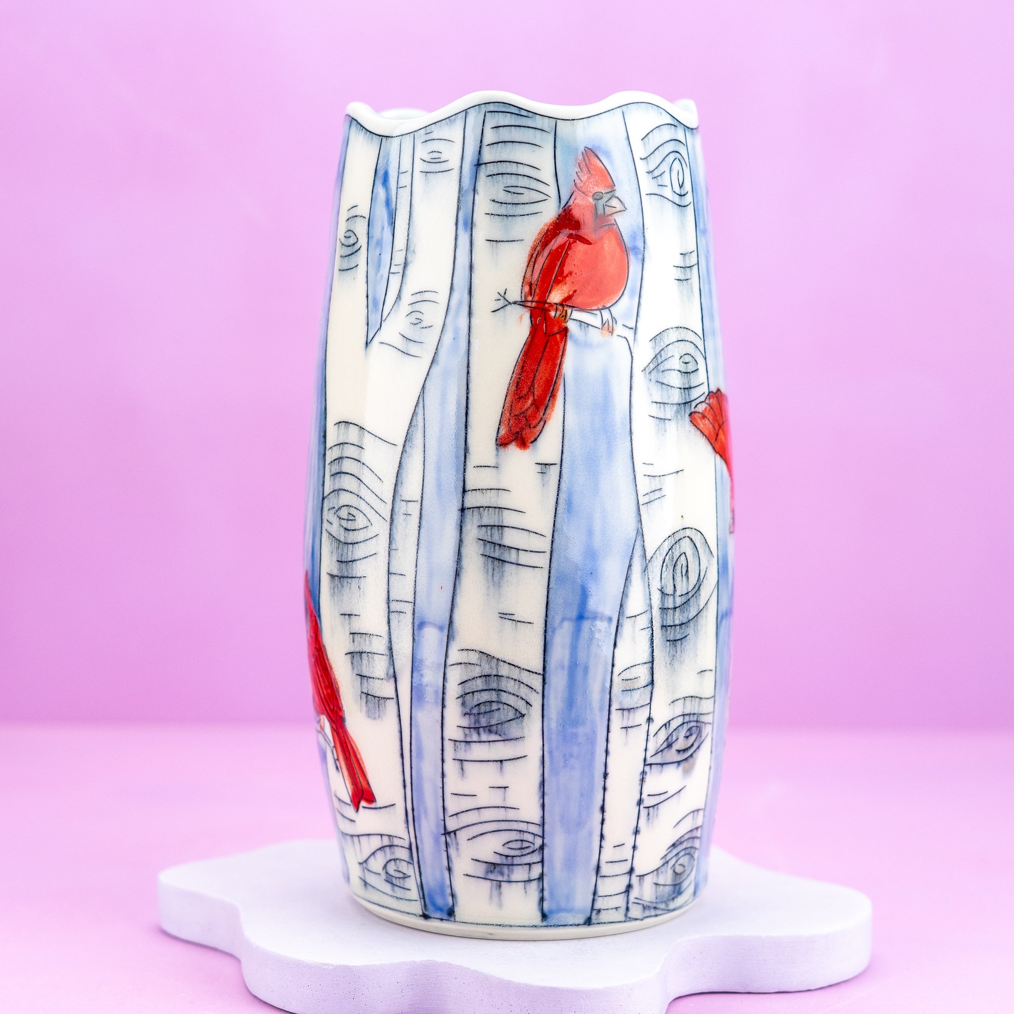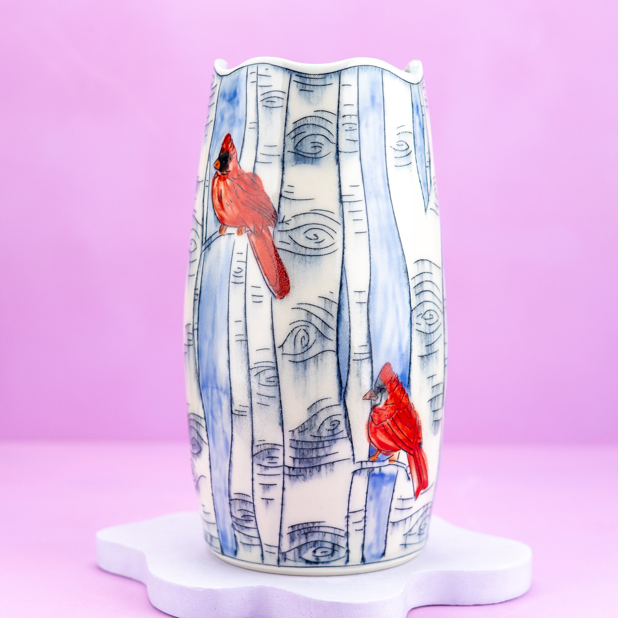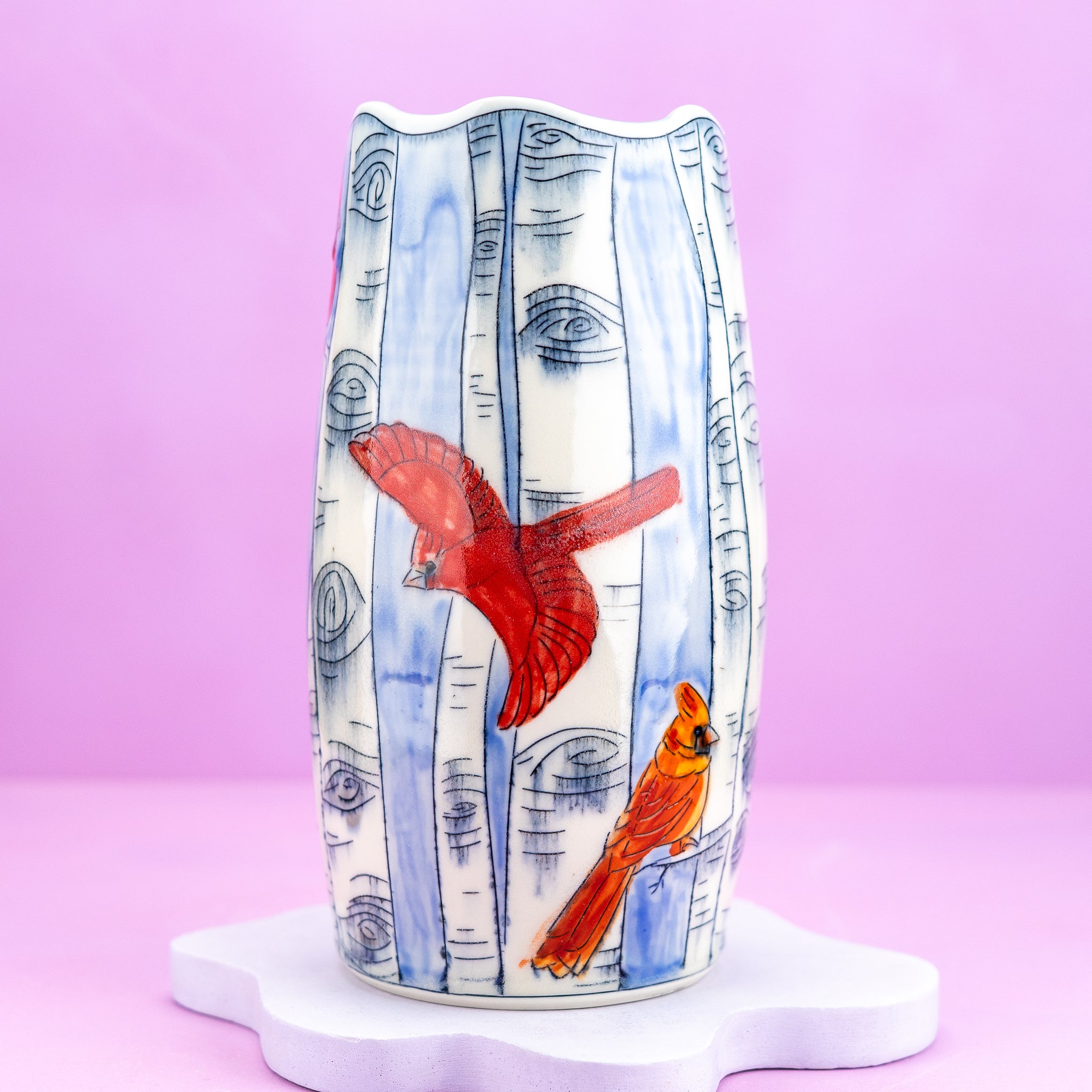Display your cherished flowers in style with this charming large vase, adorned with whimsical cardinal and birch tree illustrations set against serene blue skies.