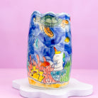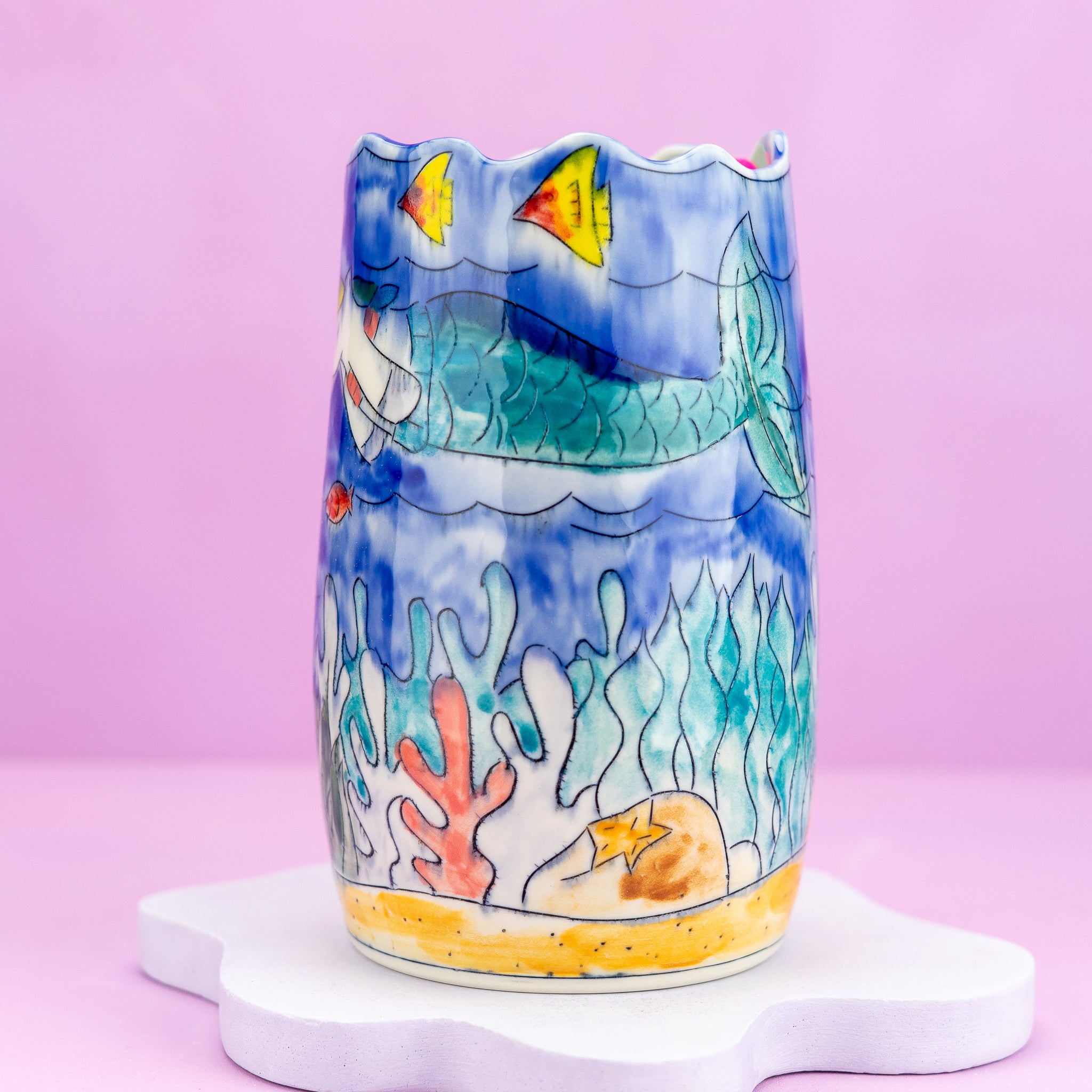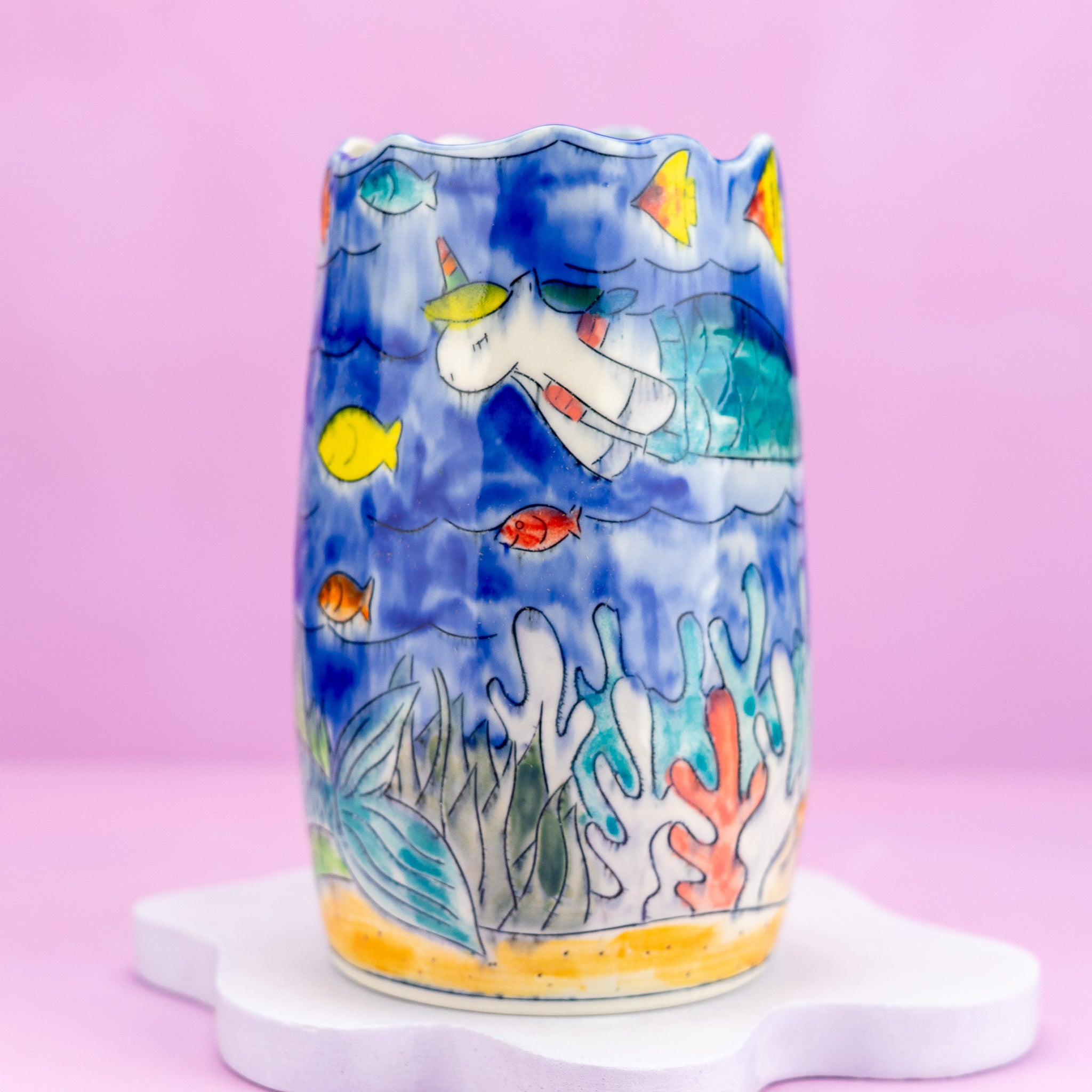 Display your blooms in whimsical style with this delightful vase featuring enchanting mermaid-unicorns gliding through an underwater wonderland of fish and coral. Perfect for adding a splash of imagination to any room, this charming piece measures approximately 3.5 x 3.5 x 6.75 inches.