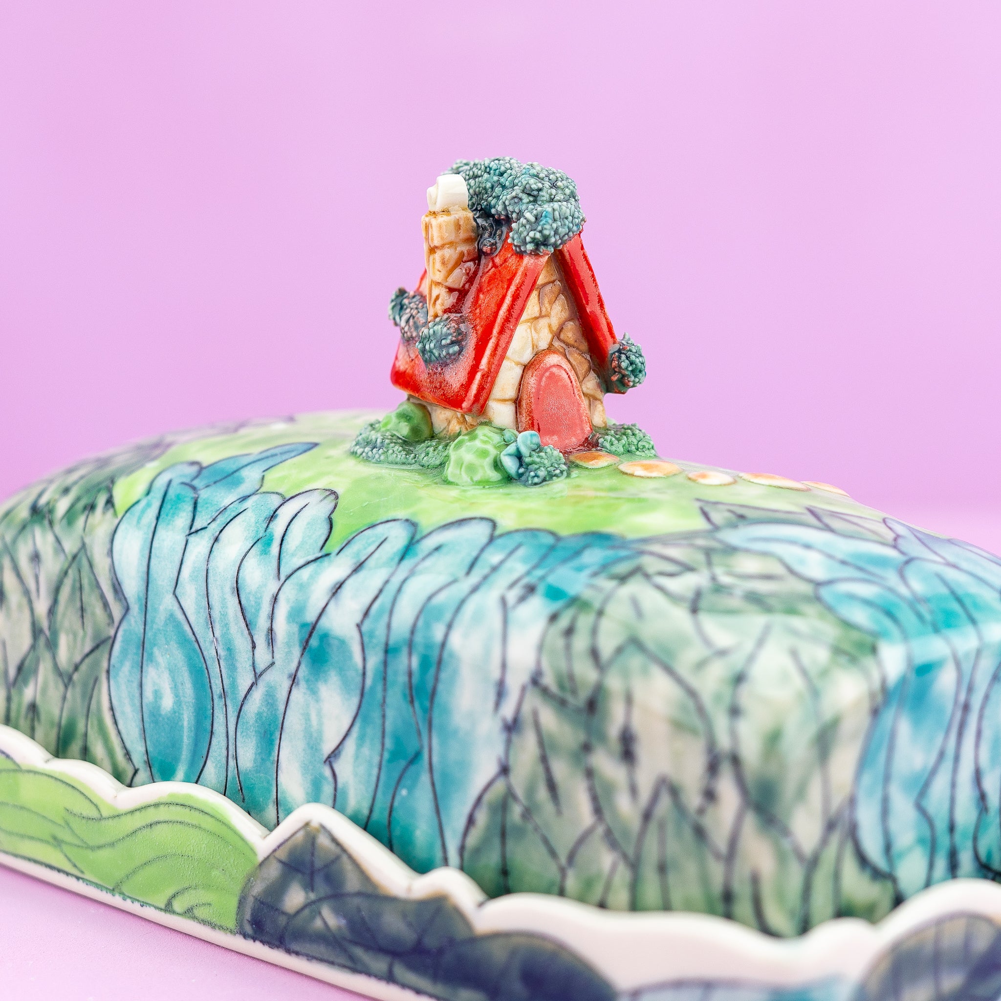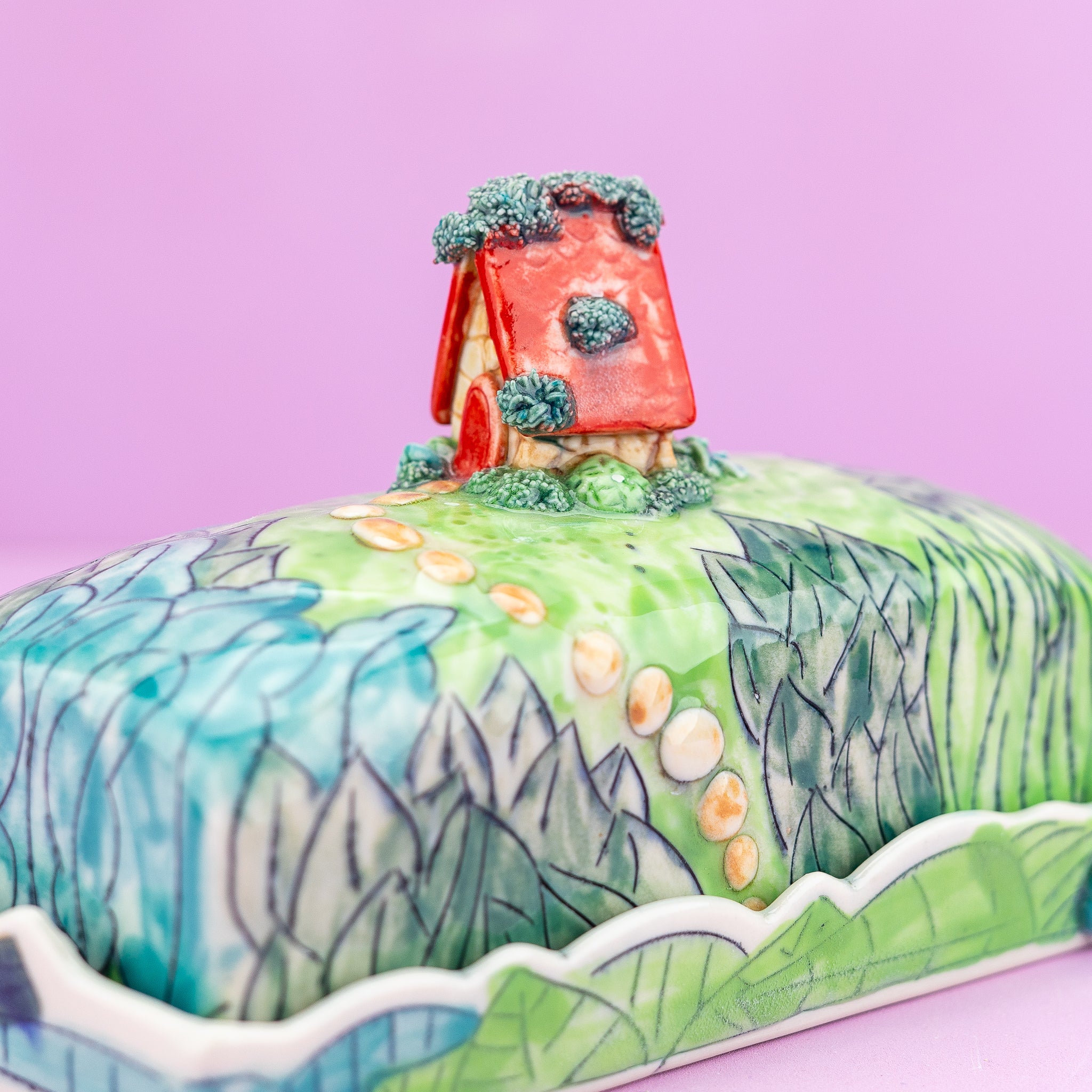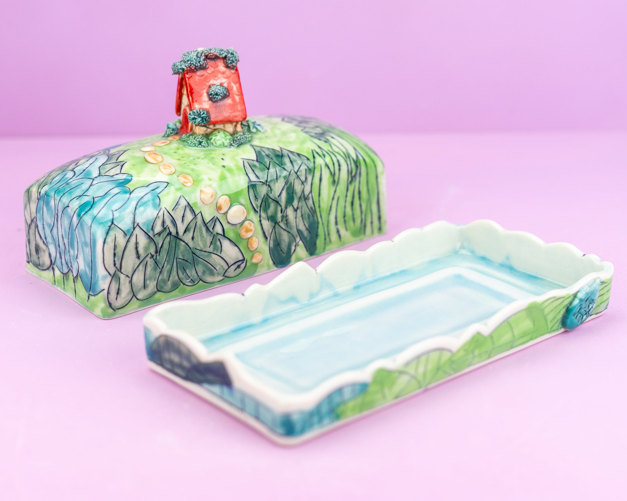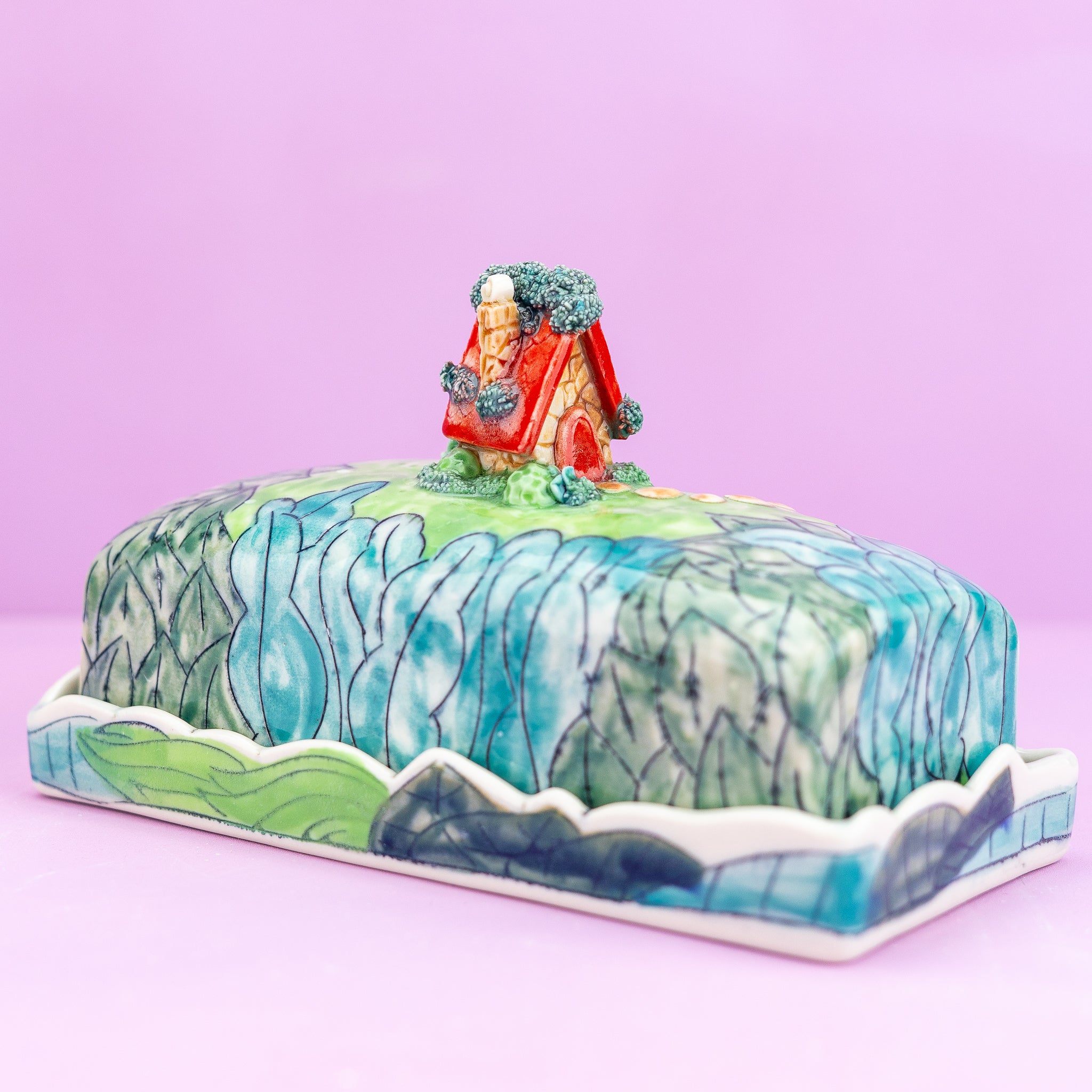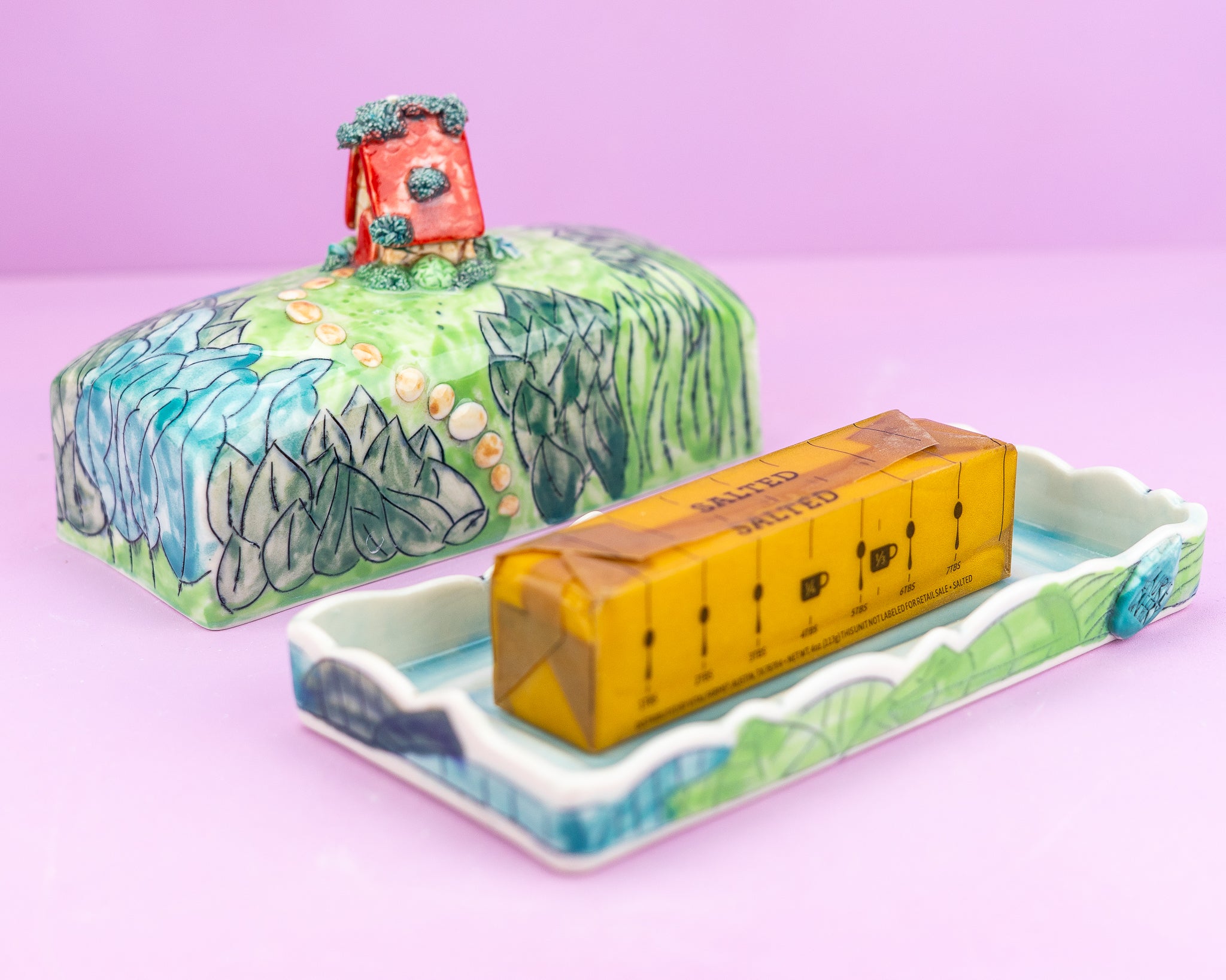 An enchanting butter dish showcasing a miniature quaint cottage surrounded by lush greenery. .A delightful home for a delightful condiment!