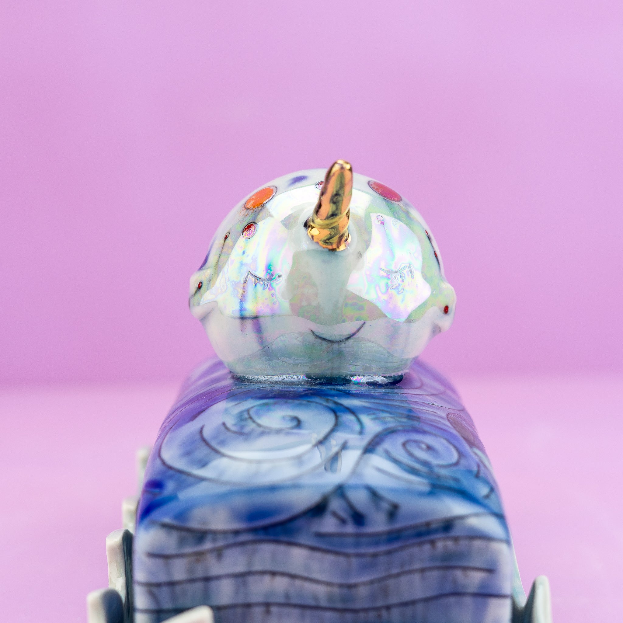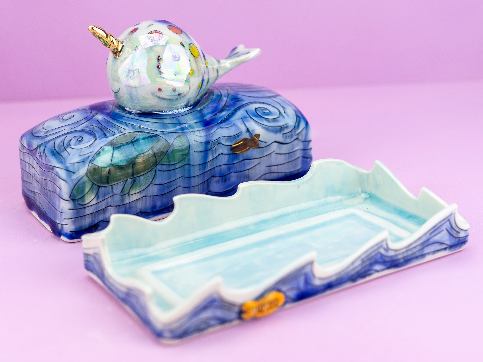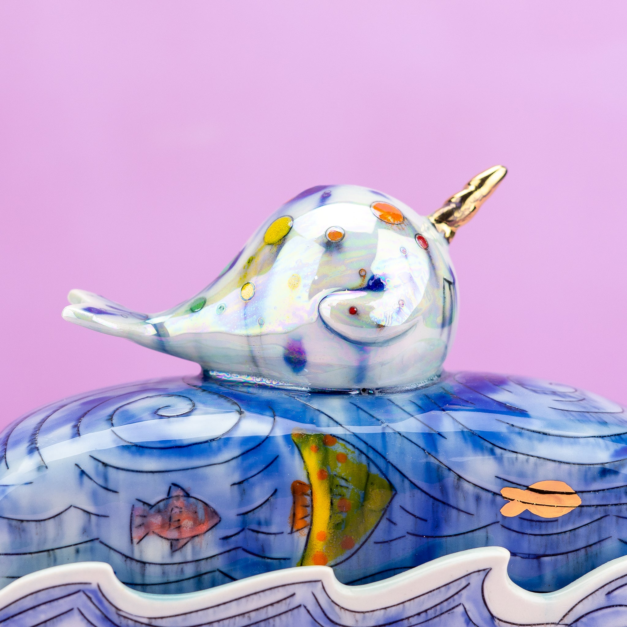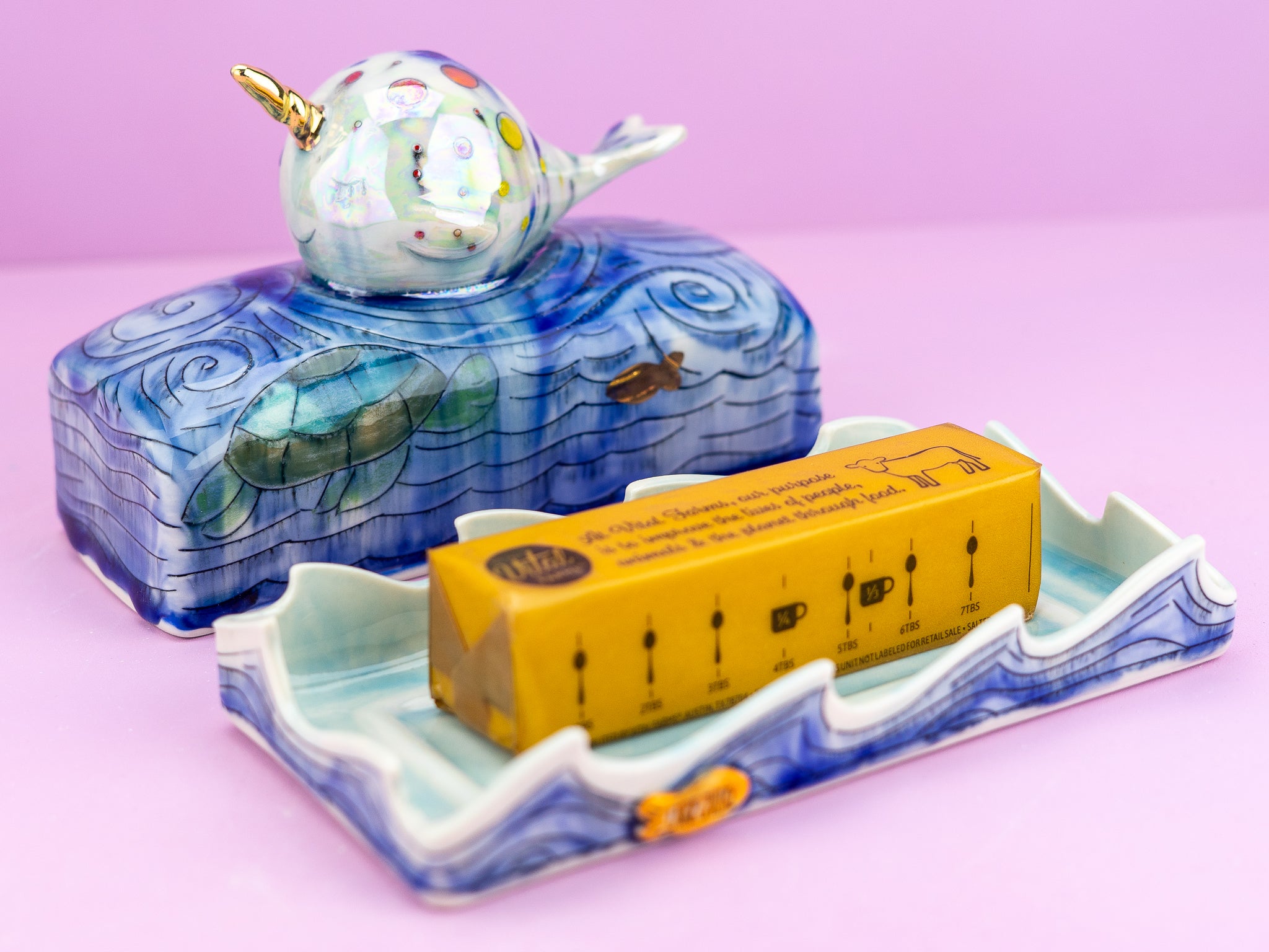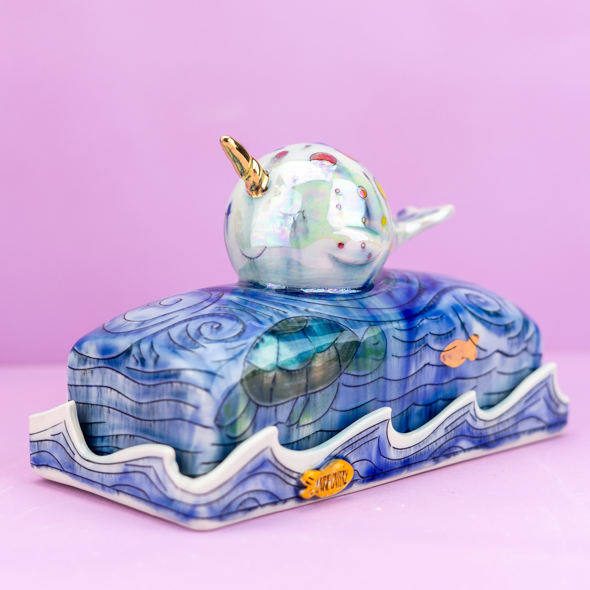 Bring a splash of whimsy to your kitchen with this playful narwhal butter dish. Featuring underwater illustrations and a sculpted happy narwhal perched on the lid, it combines function and fun. A delightful home for a delightful condiment!