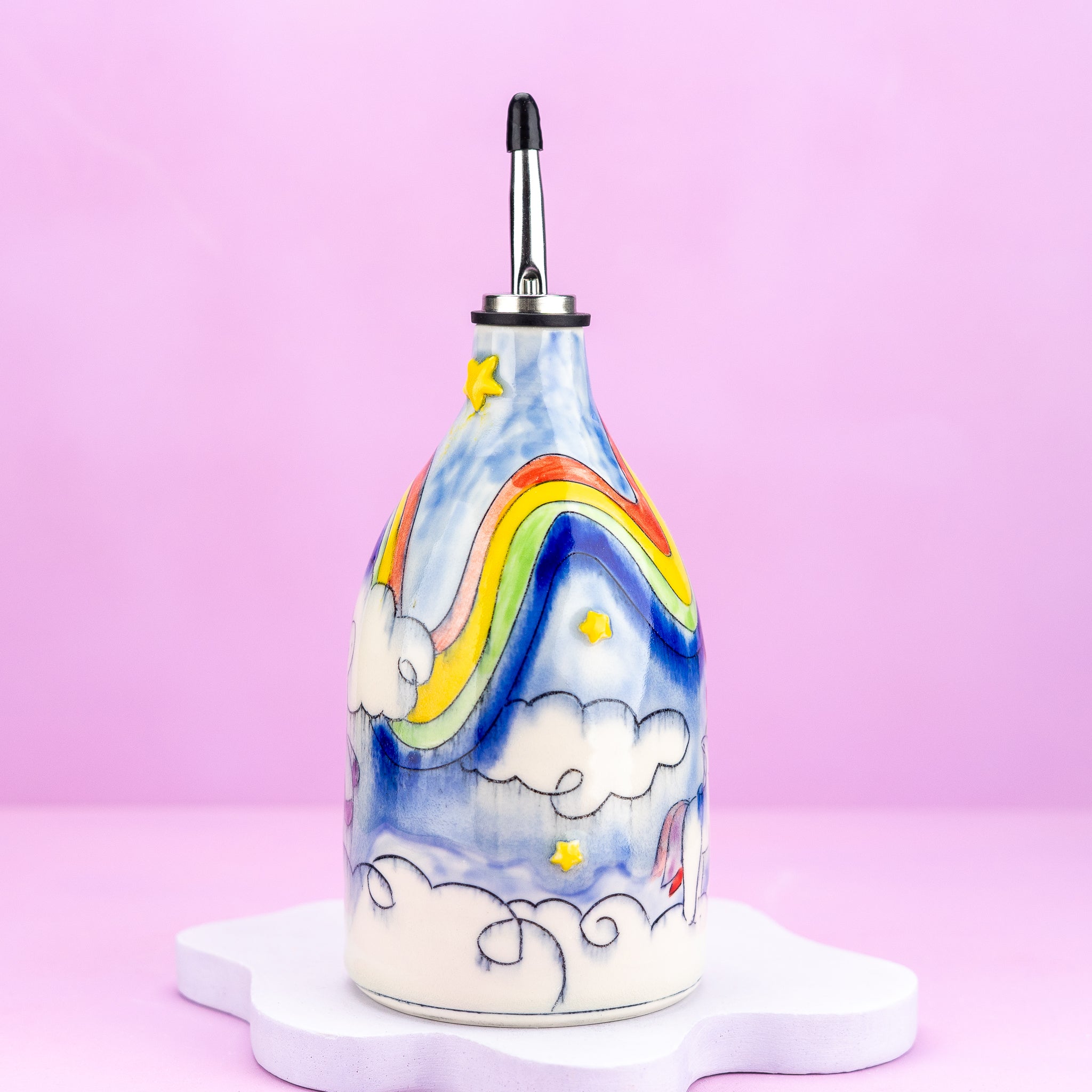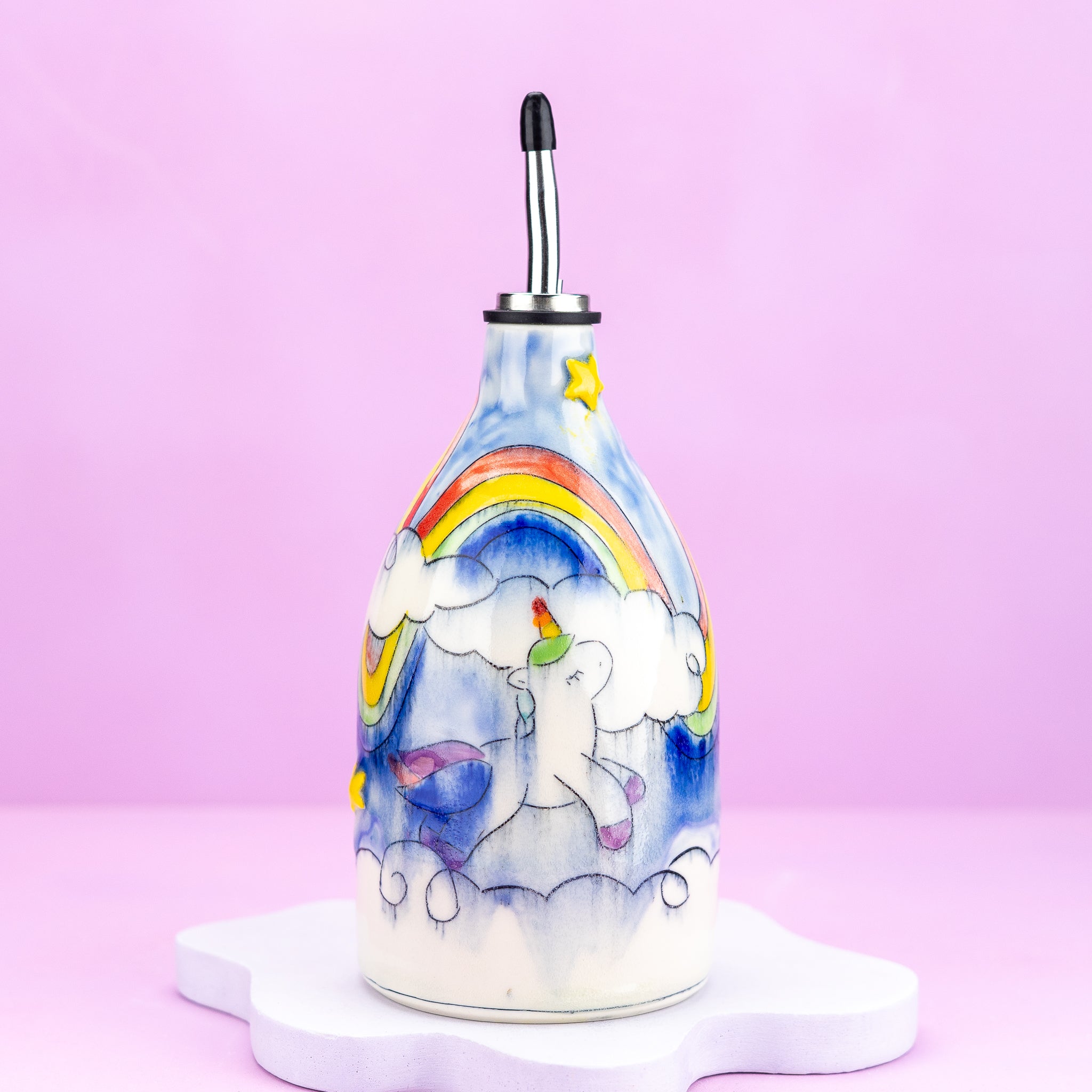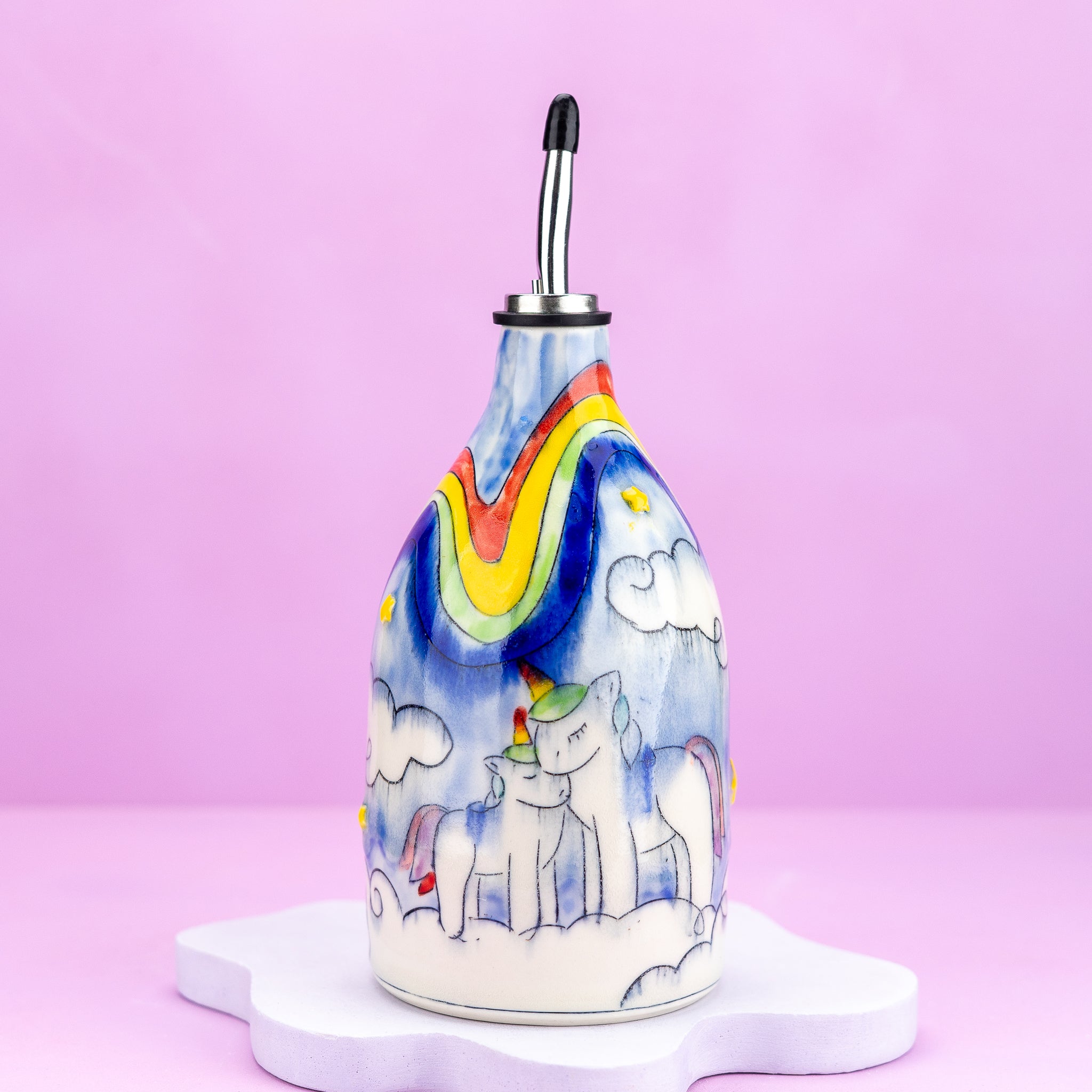 This piece features illustrations of unicorns snuggling and frolicking amongst fluffy clouds and winding rainbows. Ideal for storing your soap or extra virgin olive oil with a touch of whimsy and style.