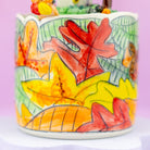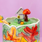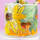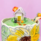 This sugar jar is topped with a teeny cottage nestled under a vibrant tree, surrounded by black cats, pumpkins and foliage. The illustration features fall foliage and sunflowers.
