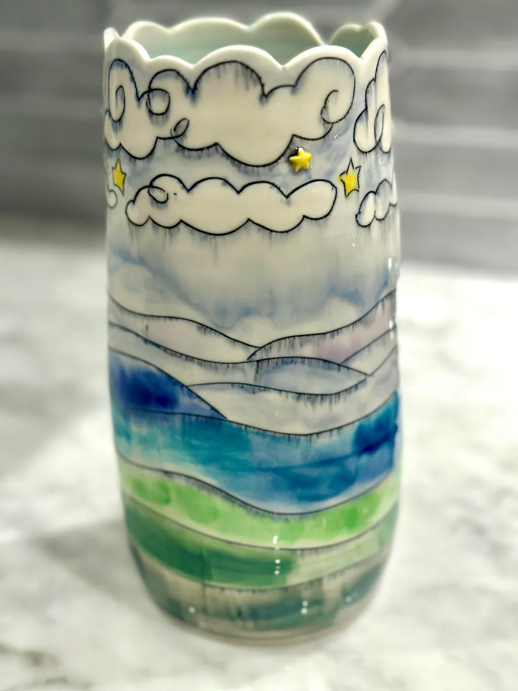 Constantly astounded my Laurie’s watercolor-esque pottery glazing!! Absolutely HAD to add a Holiday piece to my collection!!