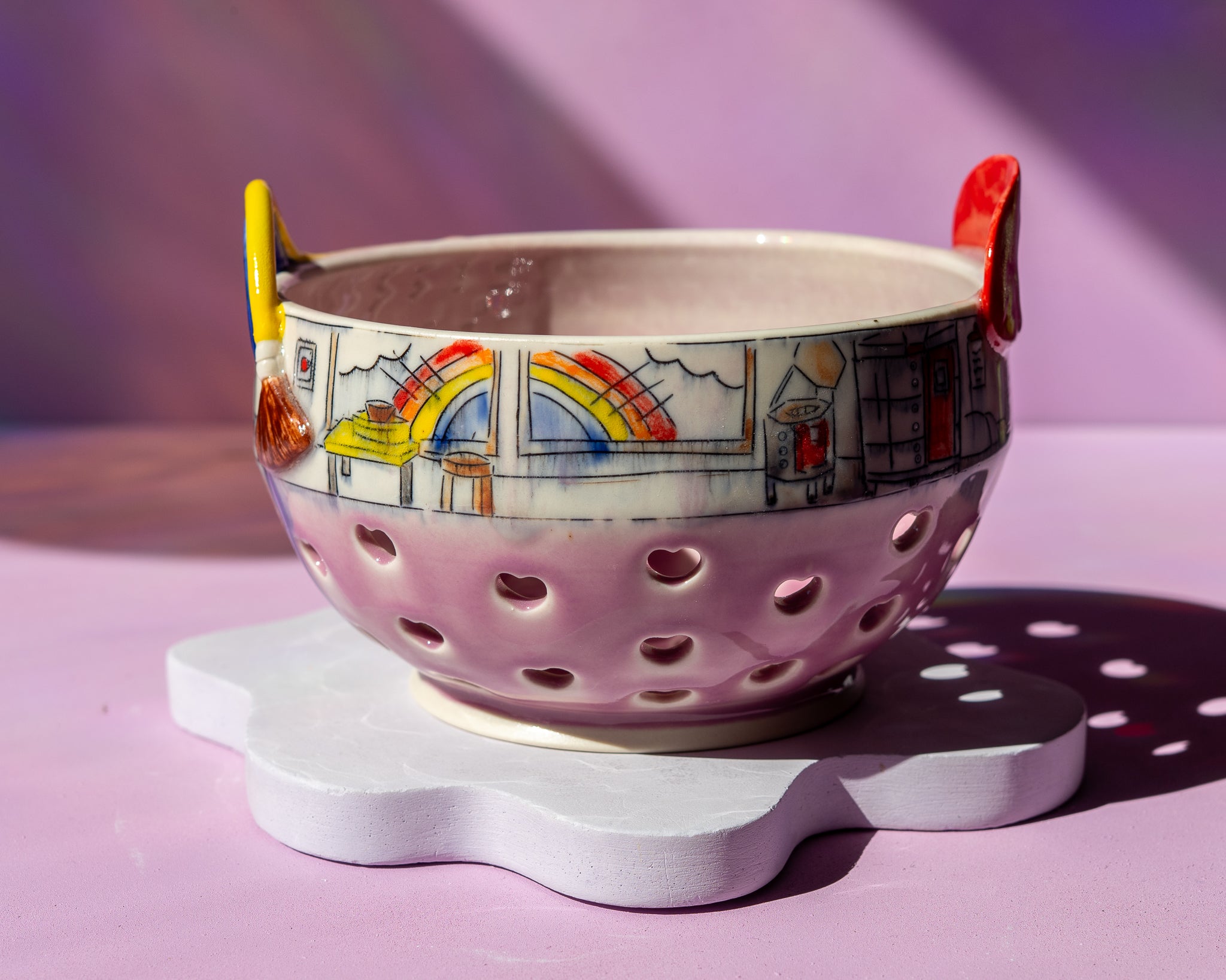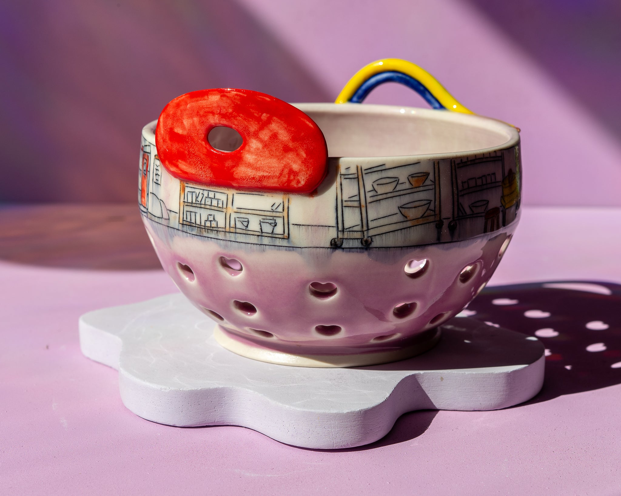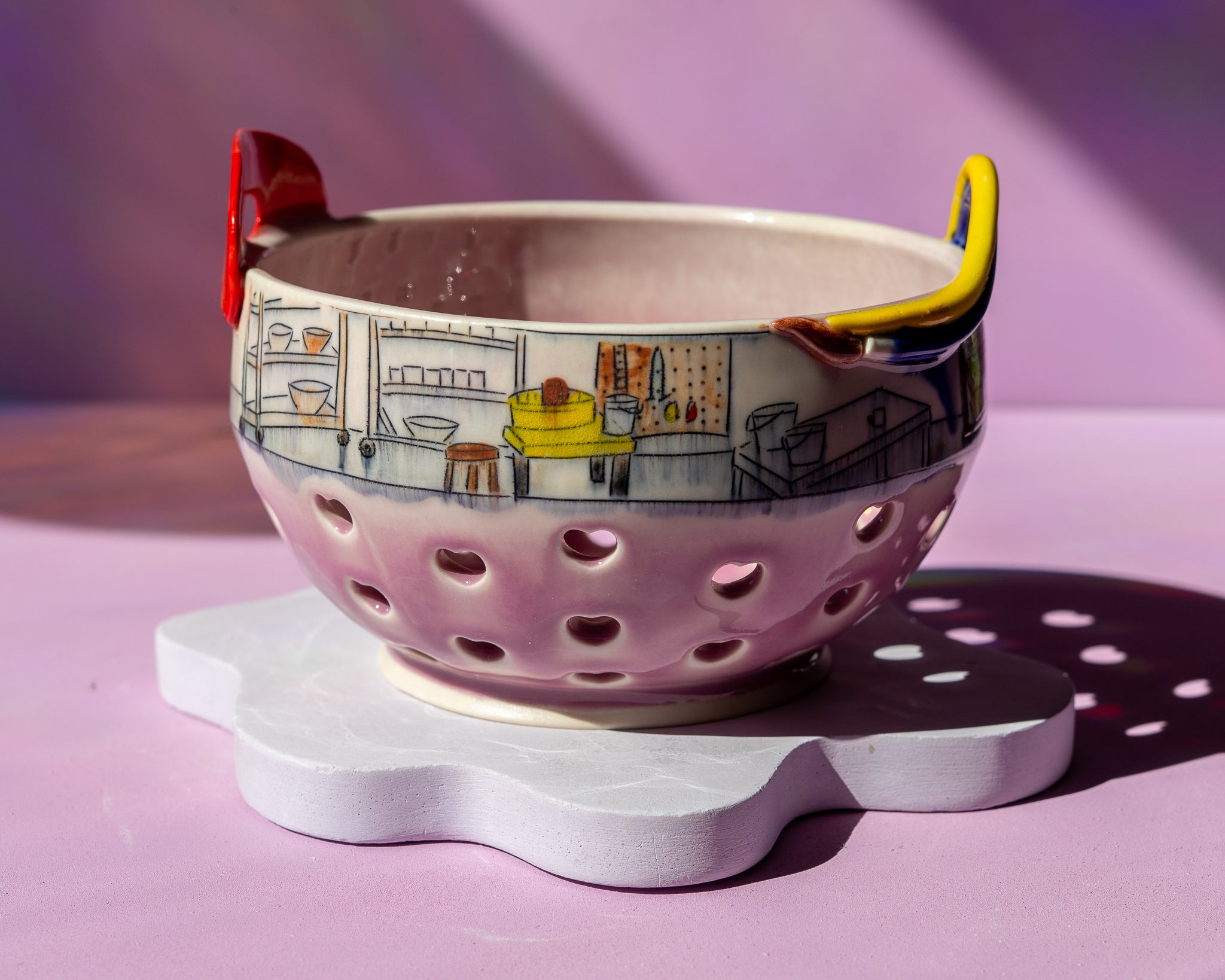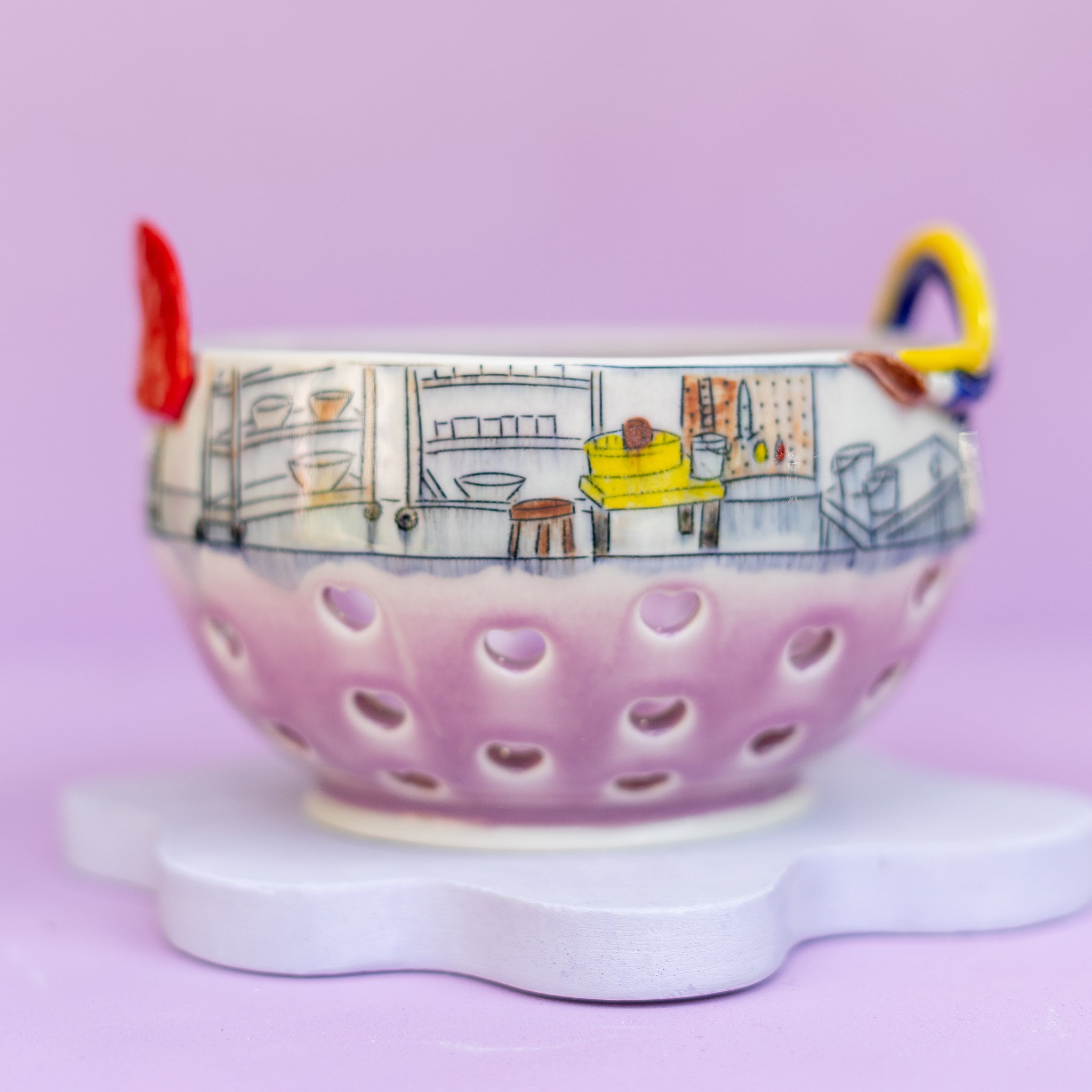 Berry bowls! A small colander made for washing fruits or veggies - perfect for single servings of nutritious snacks. This one features a detailed illustrated pottery studio and sculpted pottery tools serve as the handles. Potters will say "who made that??" and non potters will say "what's that red thing?"