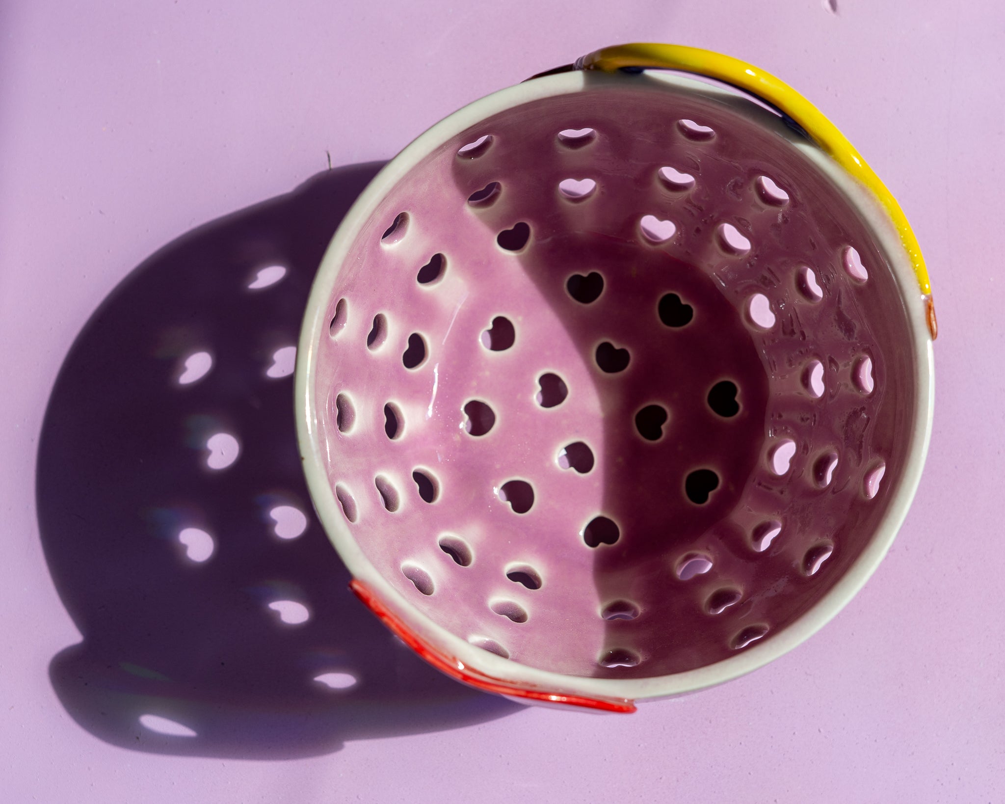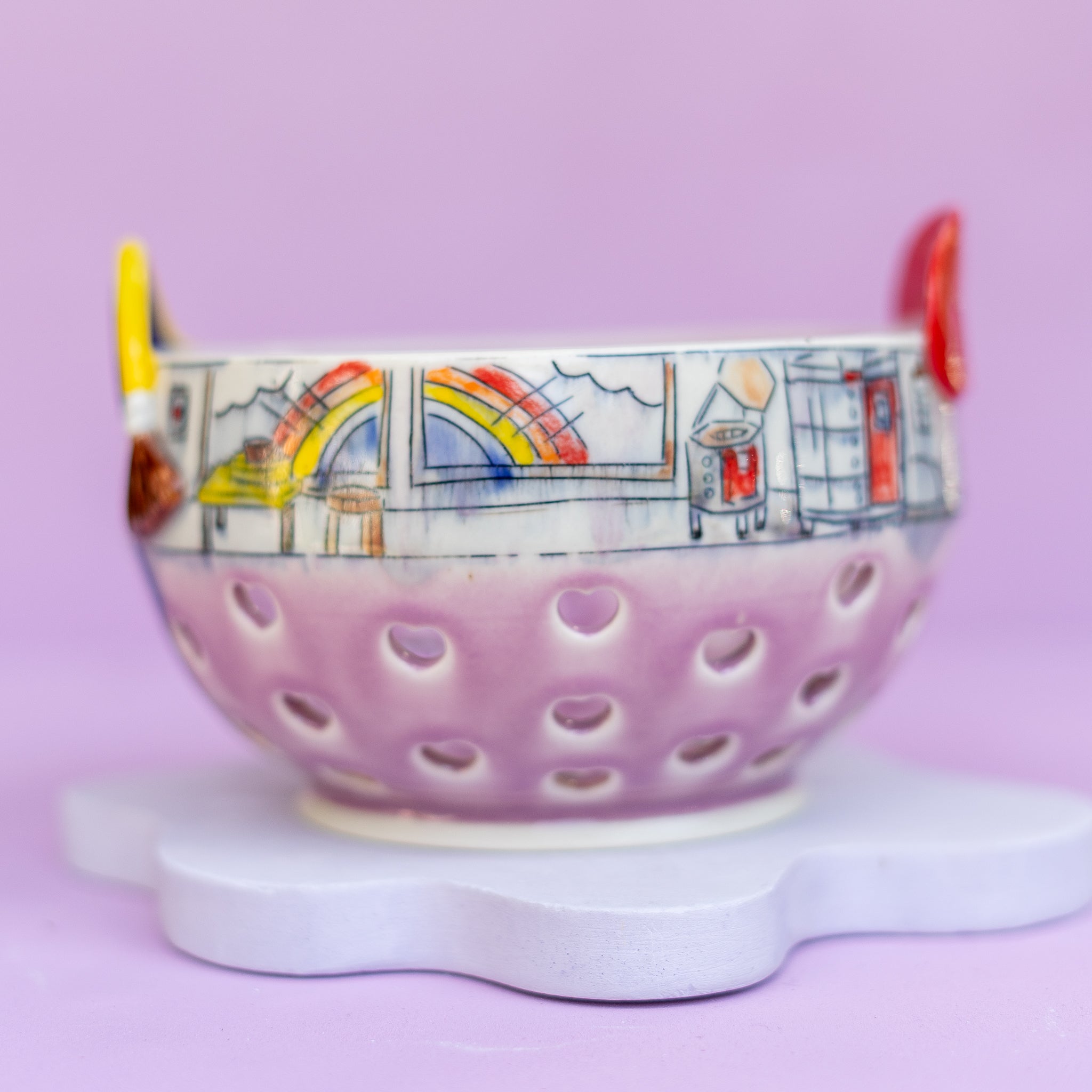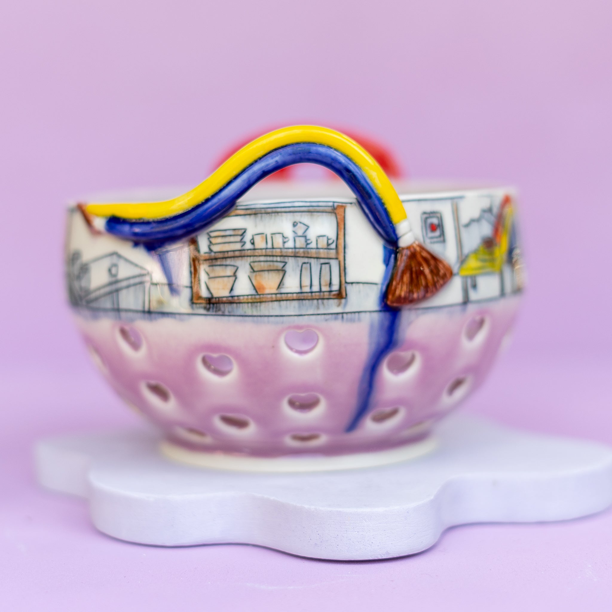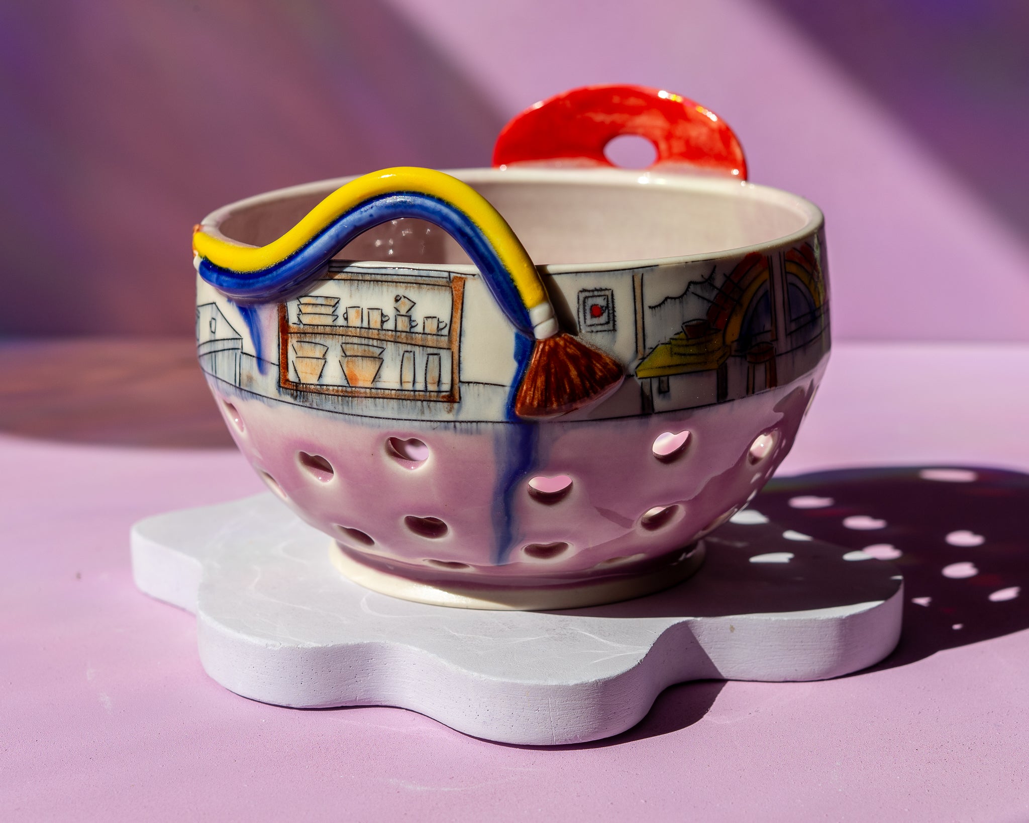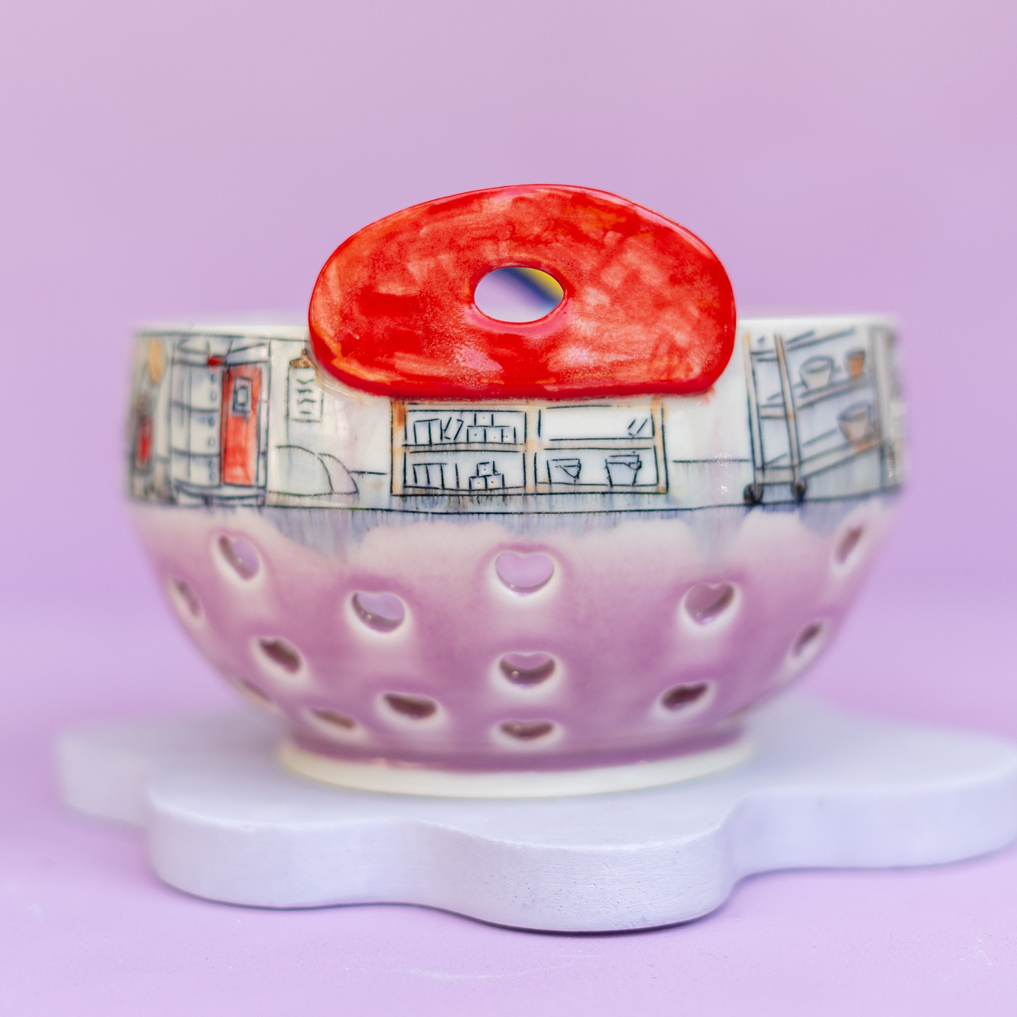 Berry bowls! A small colander made for washing fruits or veggies - perfect for single servings of nutritious snacks. This one features a detailed illustrated pottery studio and sculpted pottery tools serve as the handles. Potters will say "who made that??" and non potters will say "what's that red thing?"