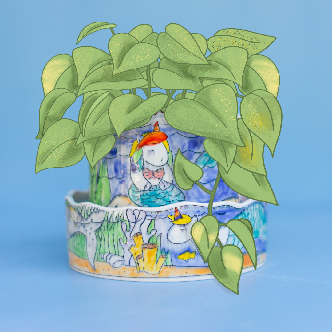 A delightful home for your plants. This planter and tray measures approximately 7.25 x 7.25 x 5.25" and features drainage holes.